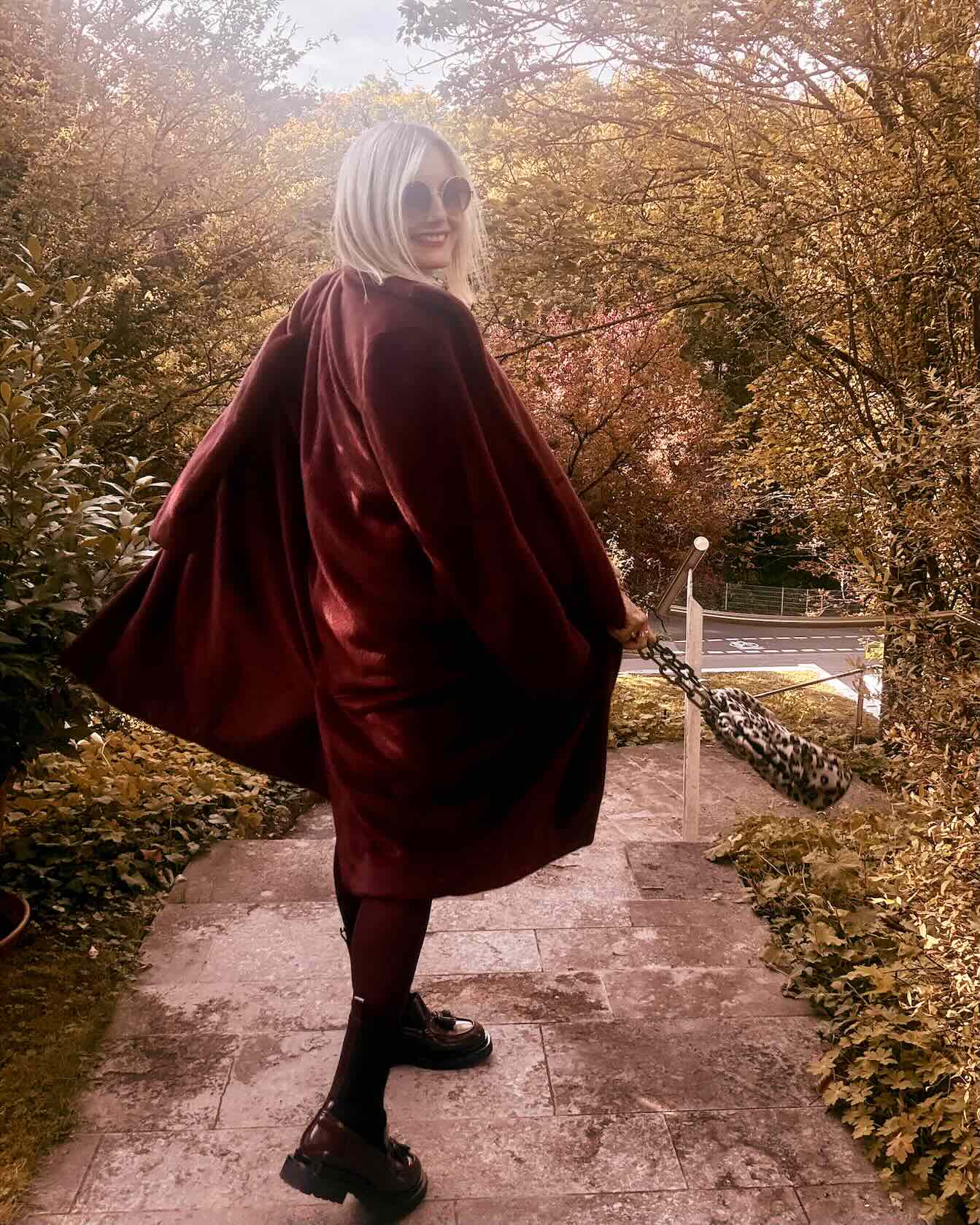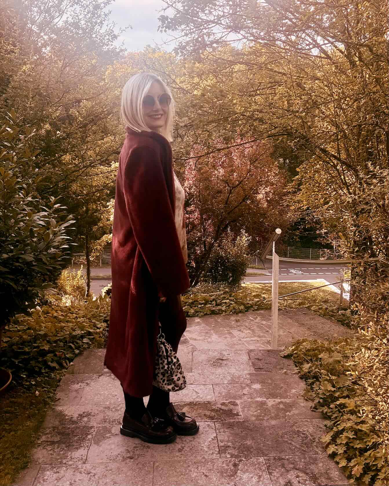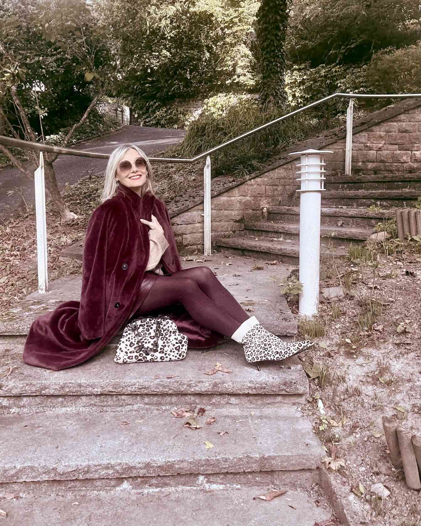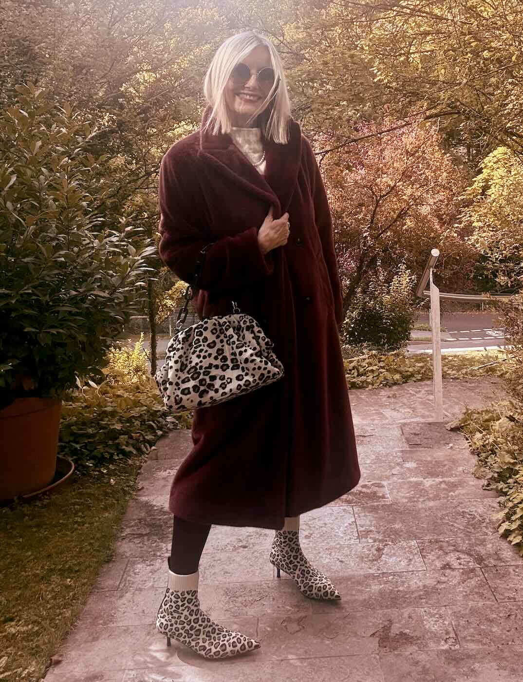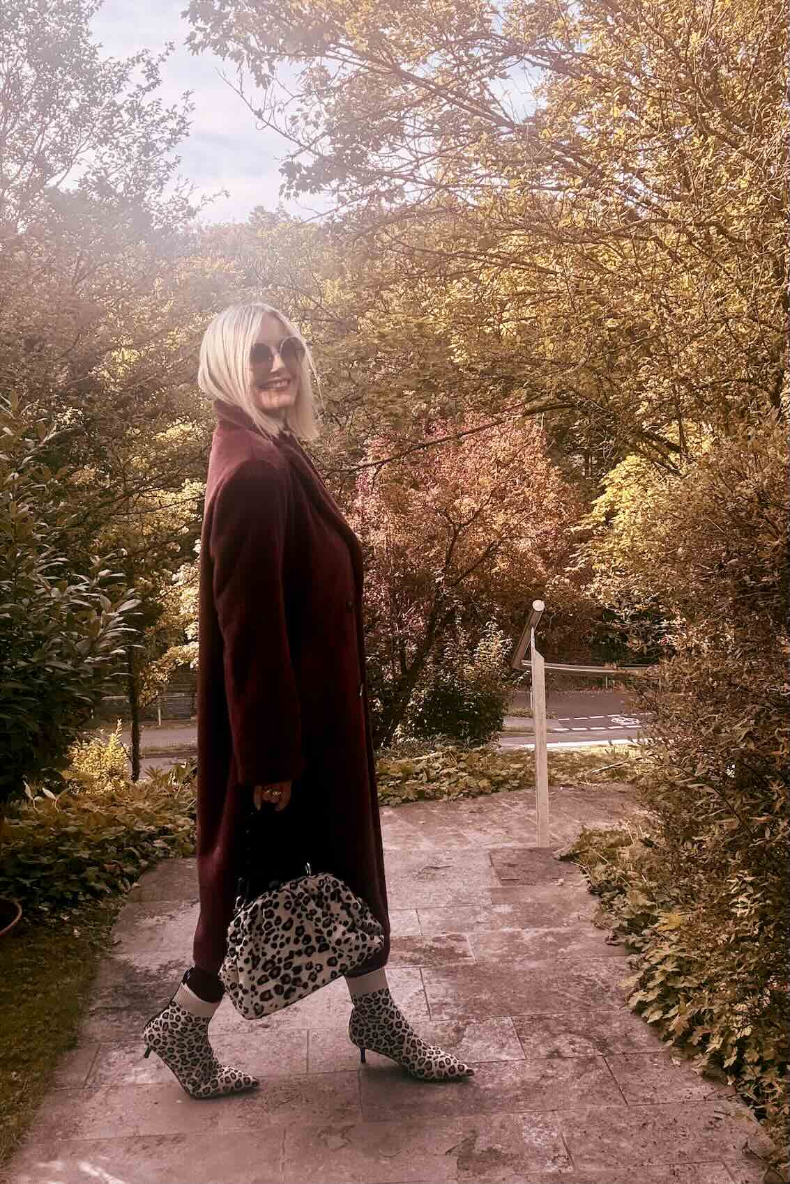 Die Leo-Stiefeletten und die passende Bag setzen bewusste Akzente – edgy, trendbewusst und mit einem Hauch Verspieltheit. Für ein alternatives Styling empfehlen sich bordeauxfarbene Loafer-Boots, die dem Look eine cleane, urbane Note verleihen.
