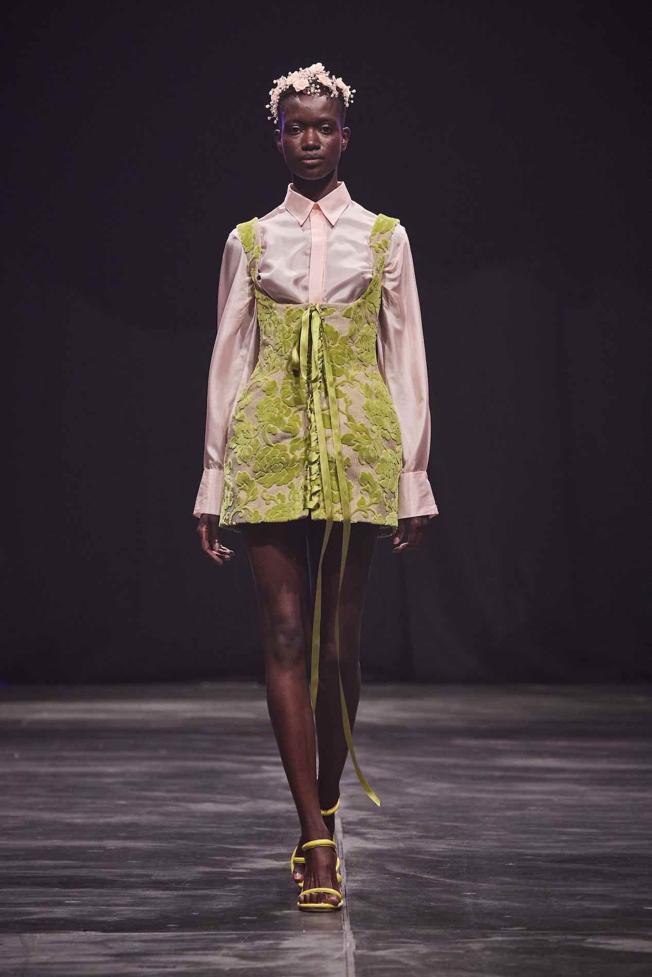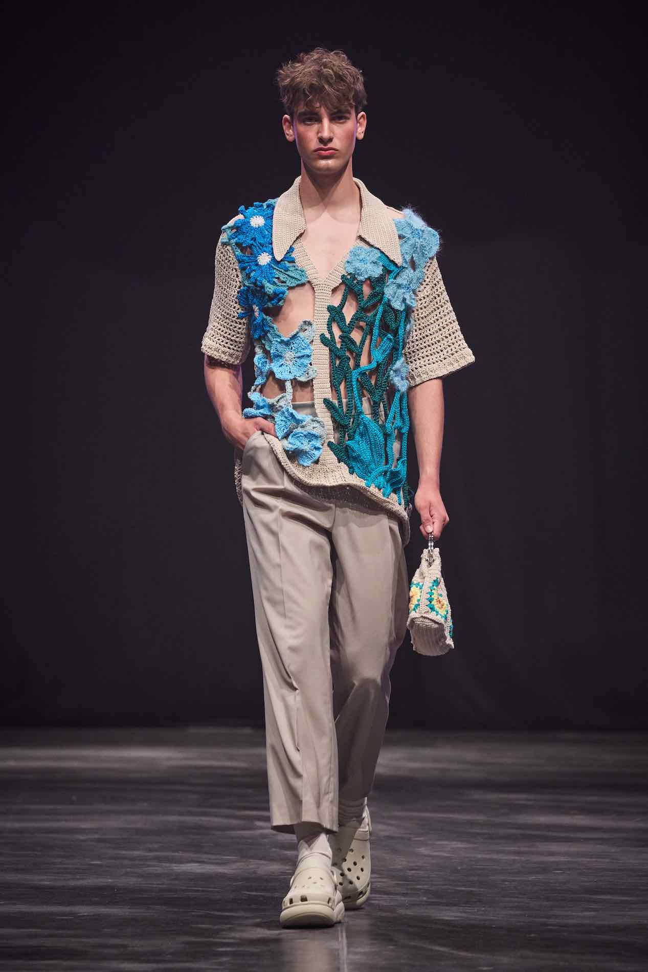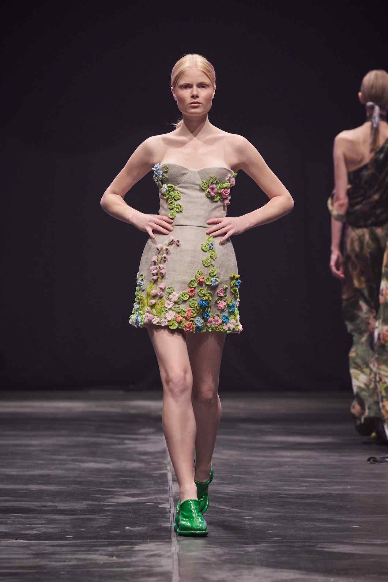 Inspiration für das tiefreichende Kollektionsthema war ein Museumsbesuch. Gründliche Recherche ist eine Säule des Schaffens von Danny Reinke – die Essenz, um einen Kosmos für neue Kollektionen zu kreieren. Ein weiterer, elementarer Baustein des Labels ist der hohe handwerkliche Anspruch. Jedes Kleidungsstück, jedes Detail wird in sorgfältiger Handarbeit im Berliner Atelier gefertigt. Für die neue Kollektion zählte Danny Reinke erstmals eine Couture-Schneiderin aus Paris zu seinem Team. In dieser Zusammenarbeit entstanden Key Pieces der SS24 Kollektion, wie ein Kleid aus über 300 von Hand gehäkelten Blüten und Blättern oder ein Tüllkleid in zartem Rosa mit ausladender Silhouette.
