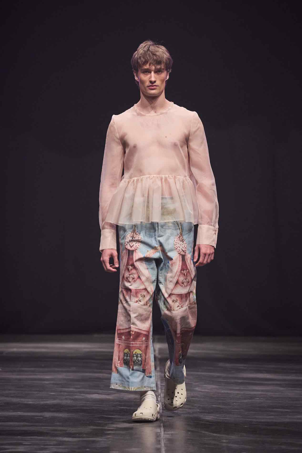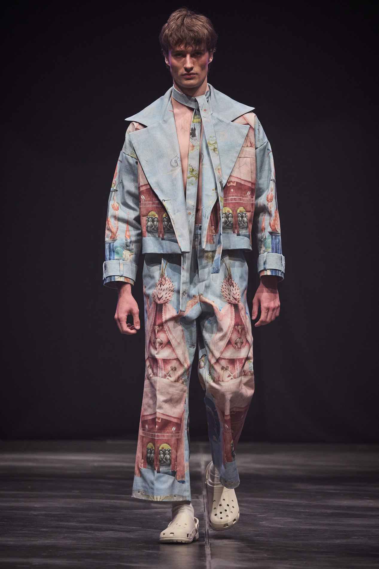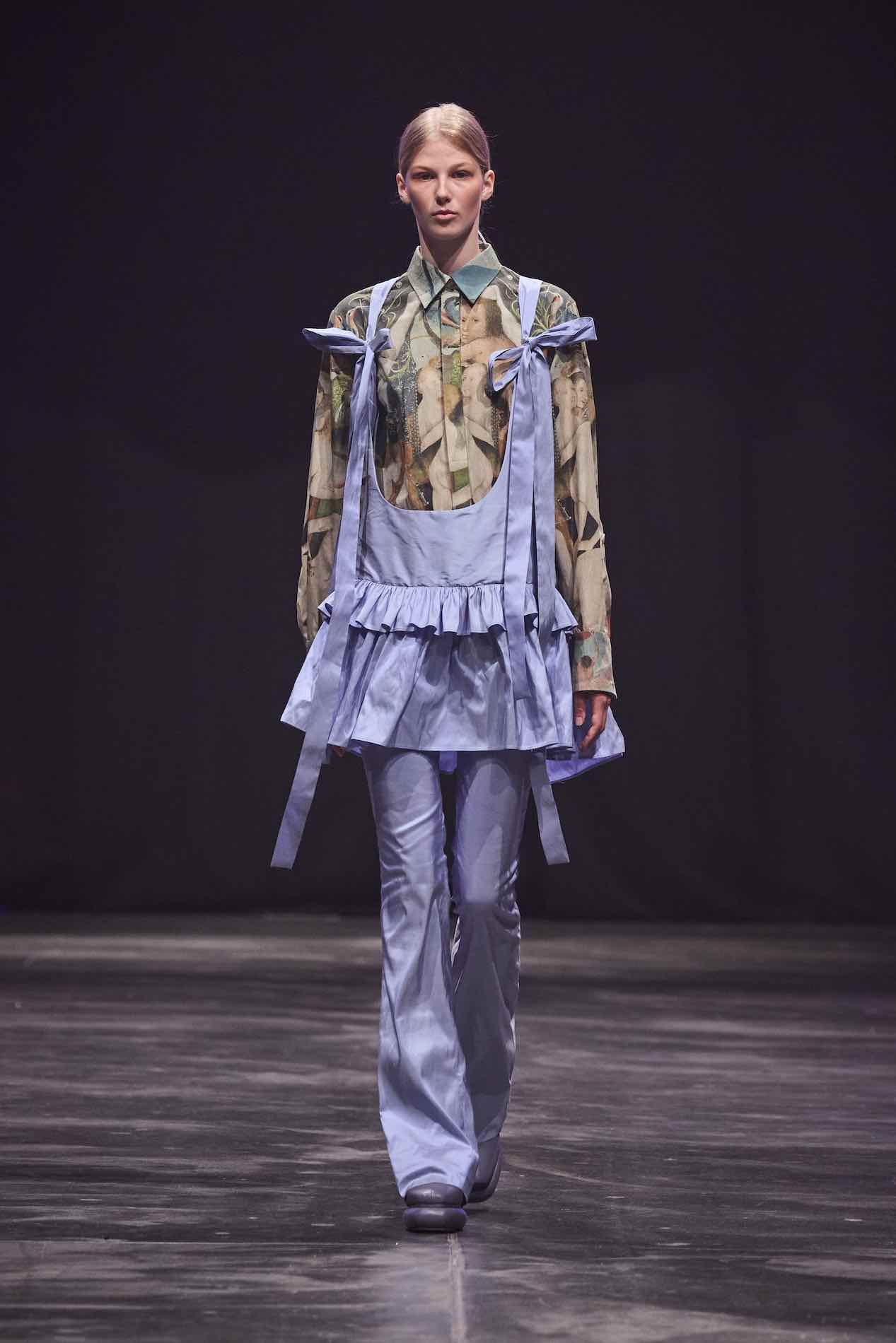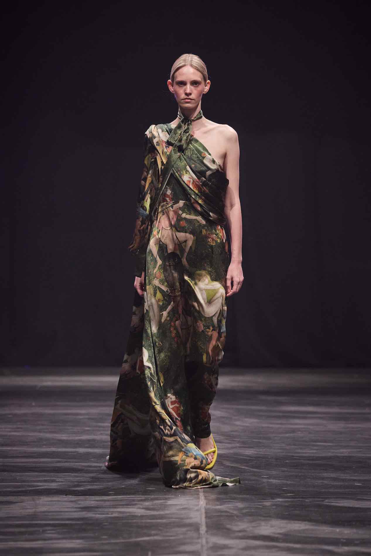 Rosé-Töne in verschiedenen Nuancen sind die Kernfarben dieser SS24-Kollektion. Kombiniert mit Blau, Brün, Greige und Weiß findet sich die zarte Farbpalette hauptsächlich auf Seidenstoffen wie Dupion, Satin und Chiffon wieder. Ein Kernelement der Kollektion sind die eigens erstellten Prints, die den Titel „Lustgarden“ mit Leben erfüllen. Als Vorlage hierfür diente das Gemälde „Garten der Lüste“ des weltberühmten Renaissance-Malers Hieronymus Bosch, das gleichermaßen Namensgeber für die Kollektion ist. Fragmente aus dem Bild wurden in die Prints übertragen, erweitert und/oder neu zusammengefügt.