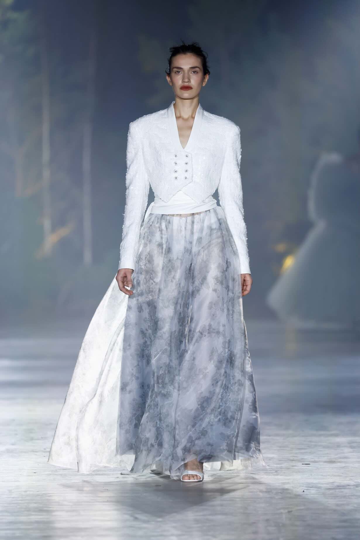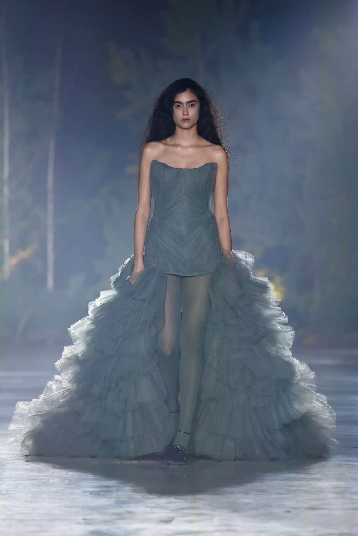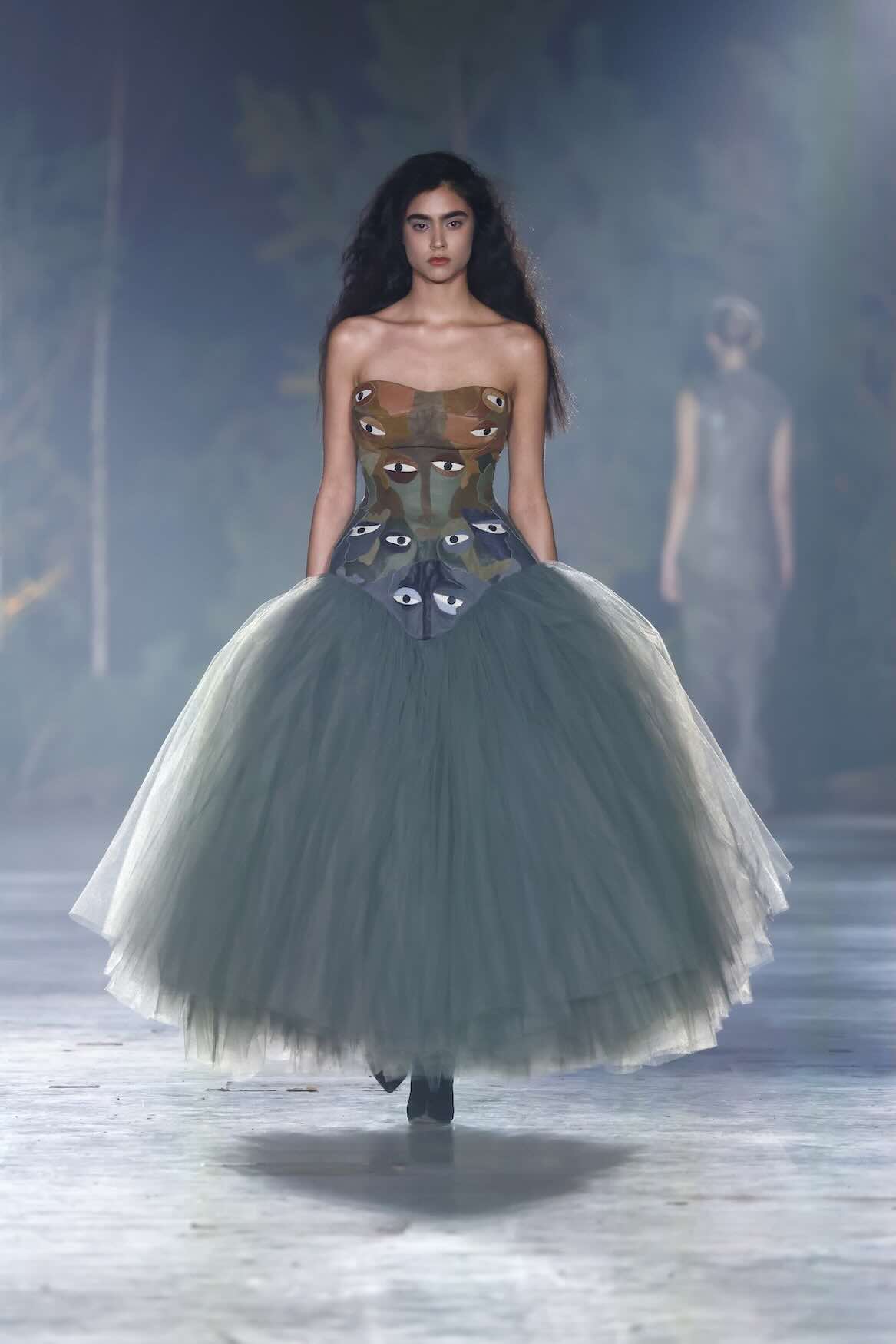 Im Fokus steht die Materialität: Tüll, transparente Stoffe sowie recycelte und Deadstock-Textilien verschmelzen zu vielschichtigen Oberflächen mit Tiefe und Charakter. Einzelne Silhouetten wirken bewusst organisch – nicht streng konstruiert, sondern wie gewachsen. Großzügige Tüllvolumen und ausladende Rüschen erzeugen Bewegung und Leichtigkeit, während präzise Schnitte die Balance halten.