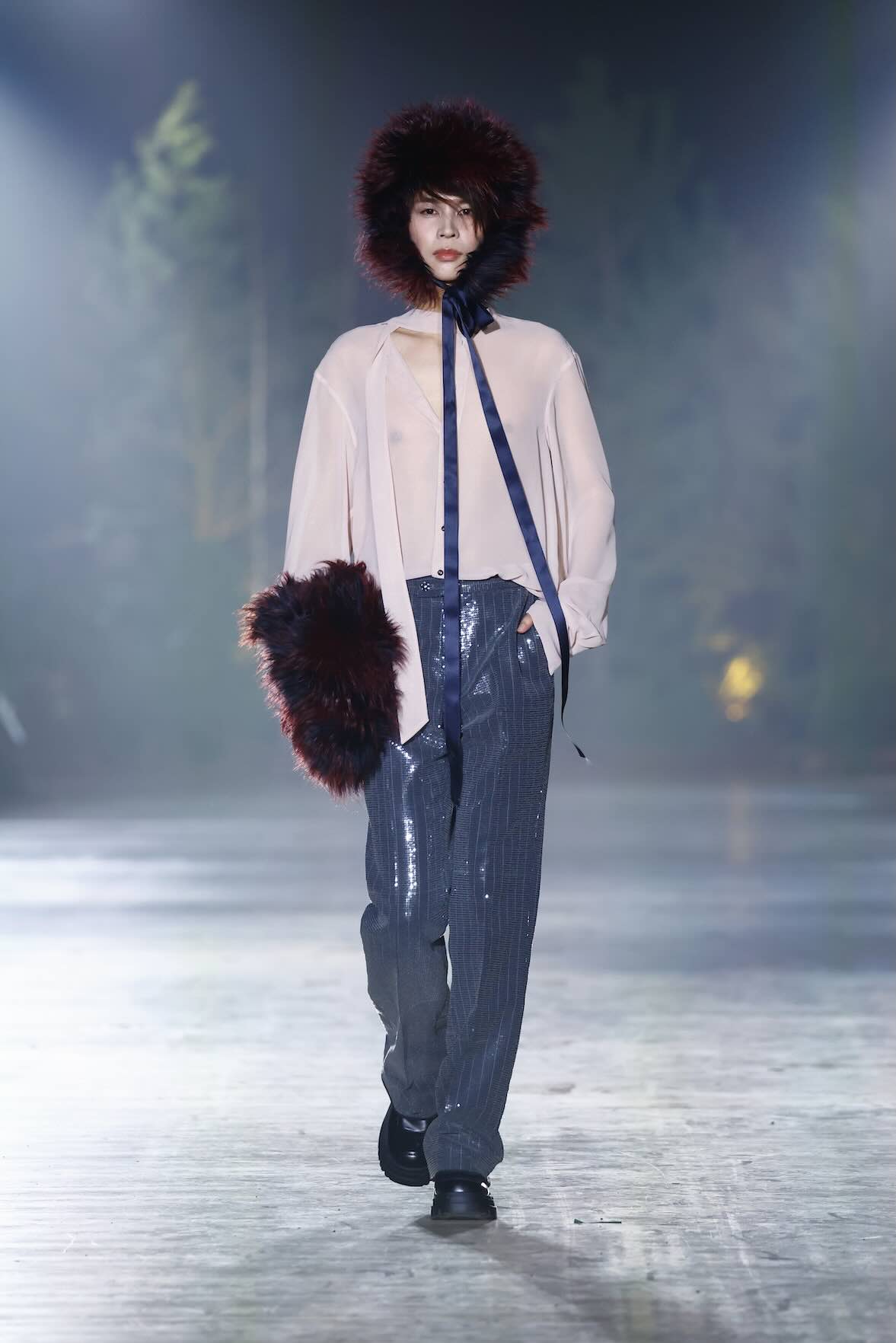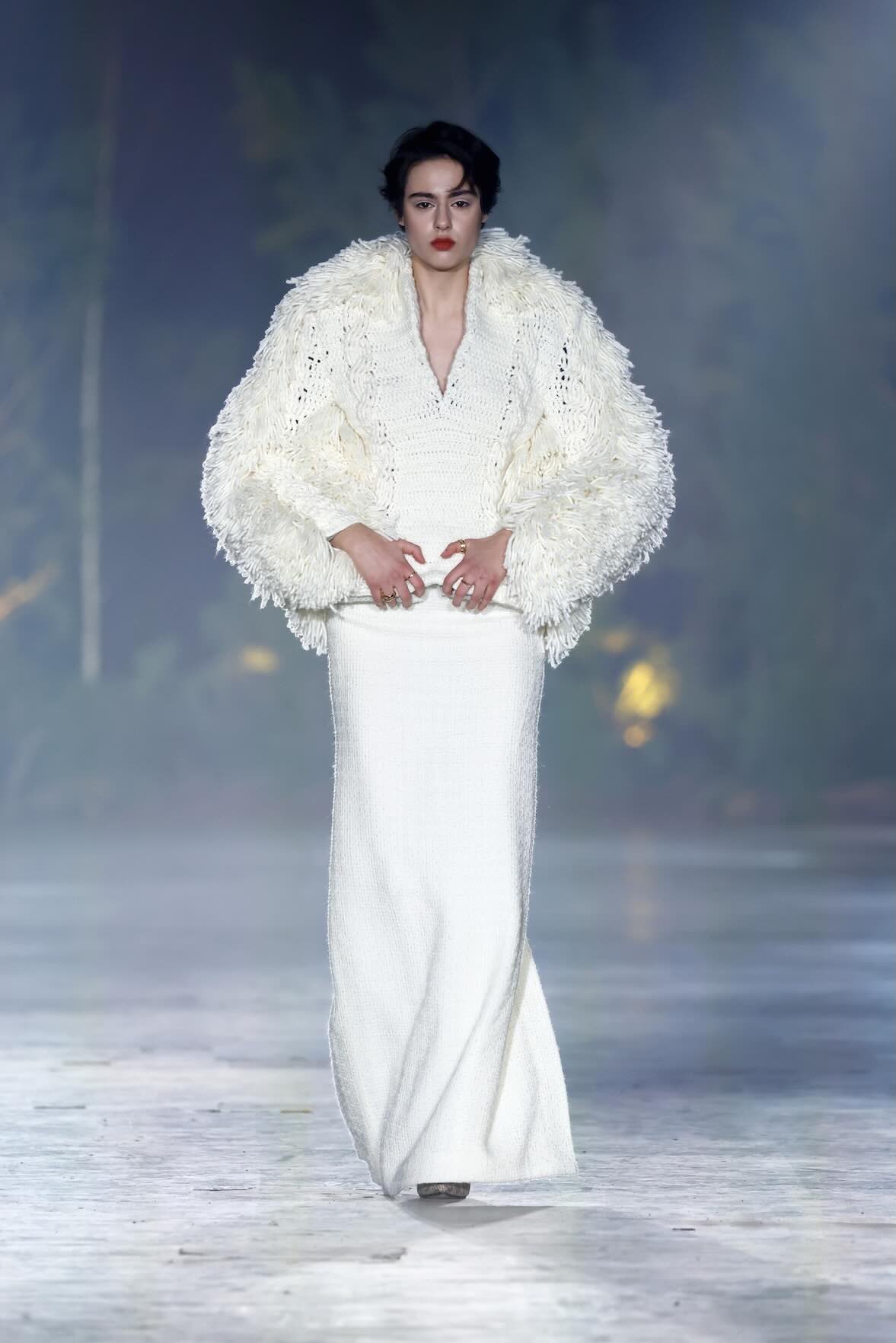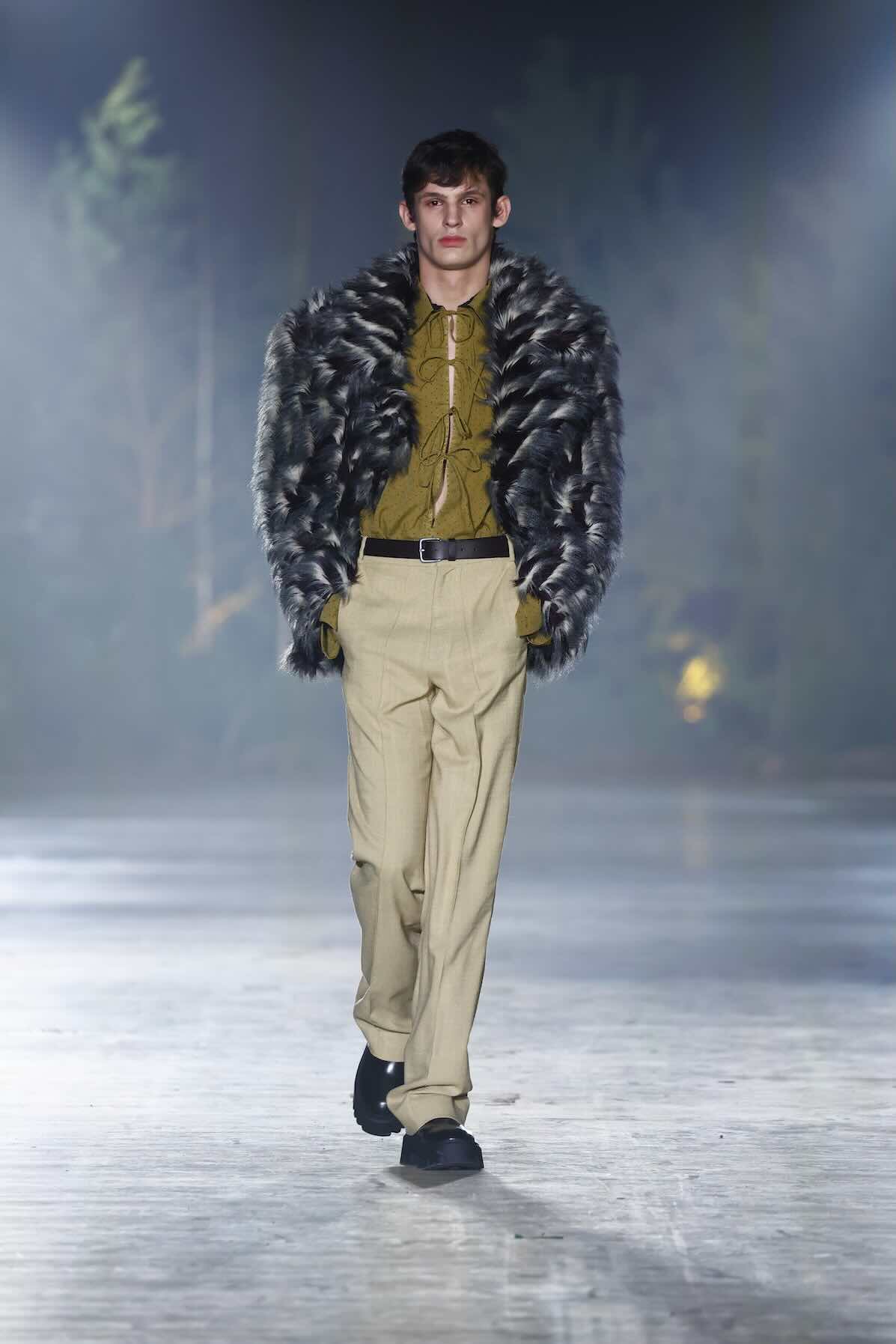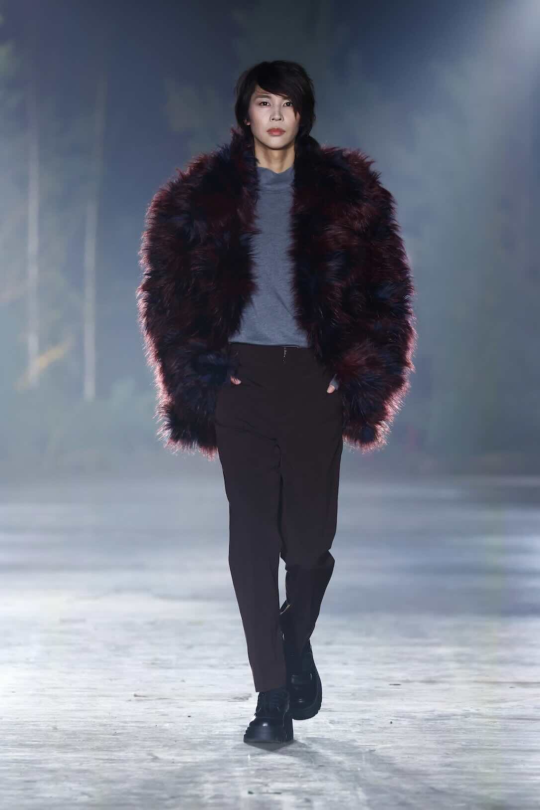Die Entwürfe bewegen sich zwischen Prêt-à-Couture und skulpturaler Modekunst. Volumenreiche Mäntel, fließende Kleider und Ensembles aus Fake Fur und Schurwolle wirken wie schützende Hüllen – kraftvoll und zugleich verletzlich. Lange Linien treffen auf fragmentierte Formen, Struktur auf Weichheit. Manche Looks scheinen beinahe lebendig, als würden sie sich langsam aus dem Dunkel lösen.