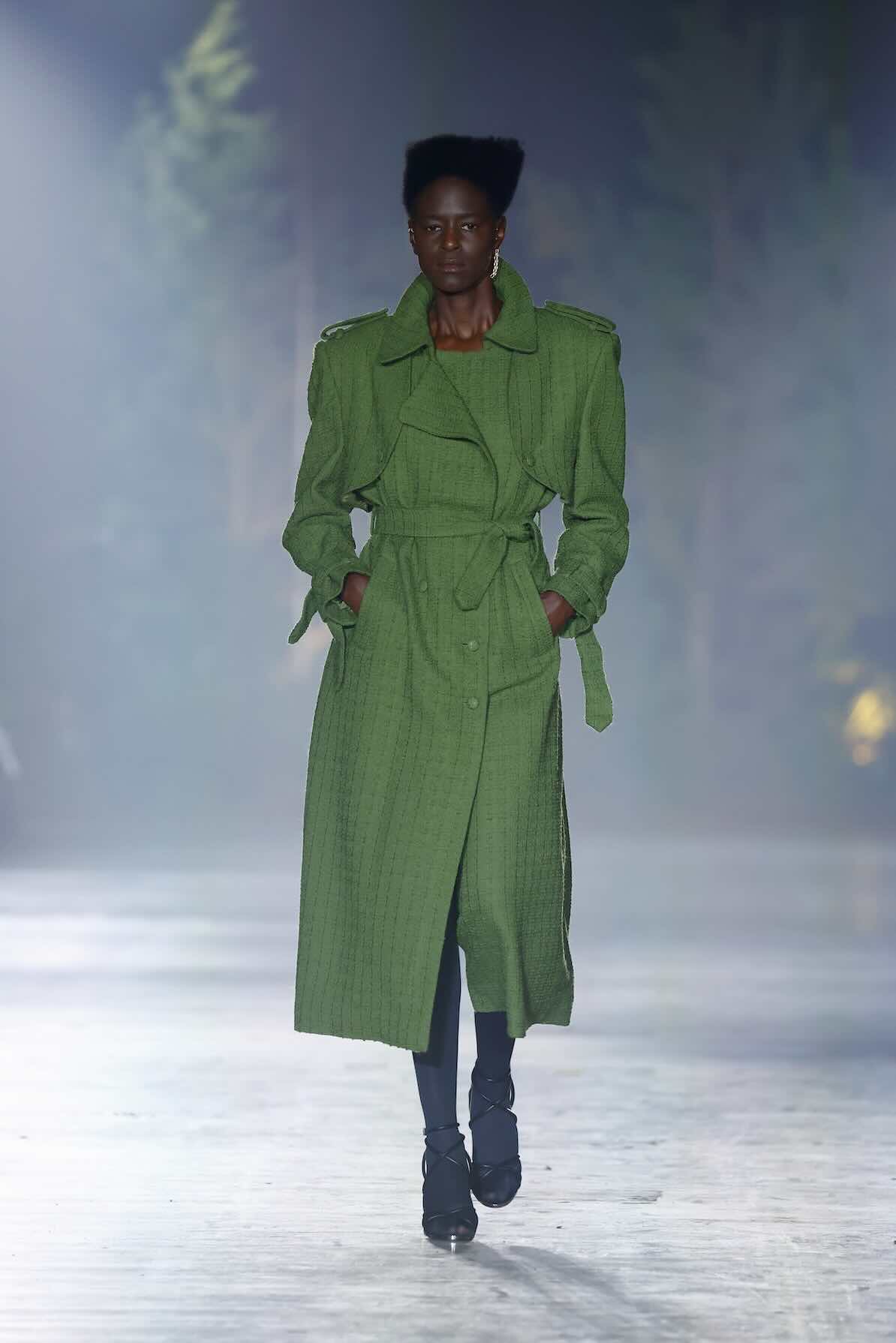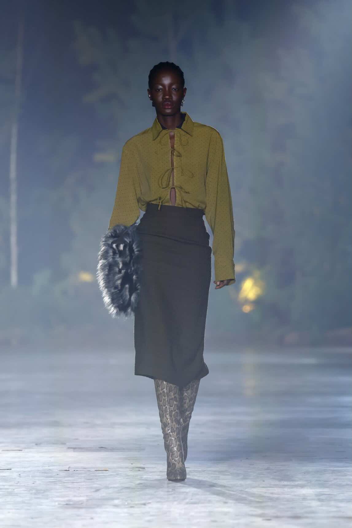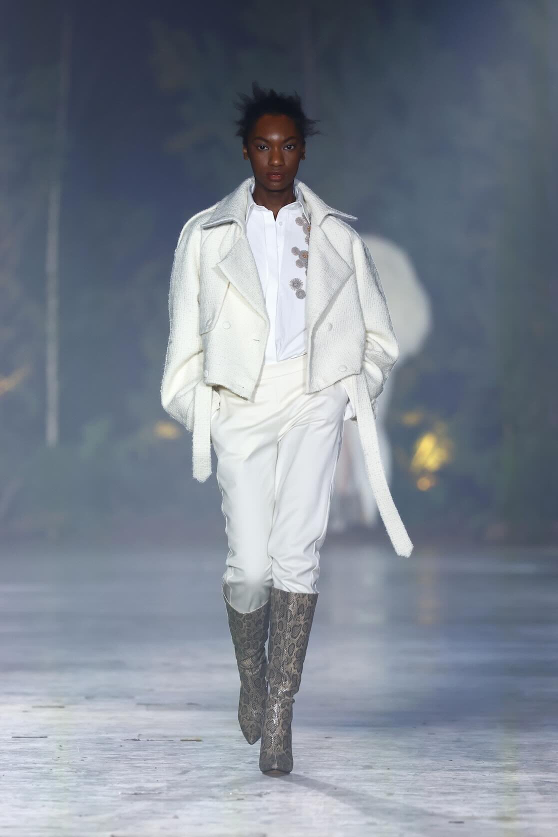 Die Entwürfe bewegen sich zwischen Prêt-à-Couture und skulpturaler Modekunst. Volumenreiche Mäntel, fließende Kleider und Ensembles aus Fake Fur und Schurwolle wirken wie schützende Hüllen – kraftvoll und zugleich verletzlich. Lange Linien treffen auf fragmentierte Formen, Struktur auf Weichheit. Manche Looks scheinen beinahe lebendig, als würden sie sich langsam aus dem Dunkel lösen.