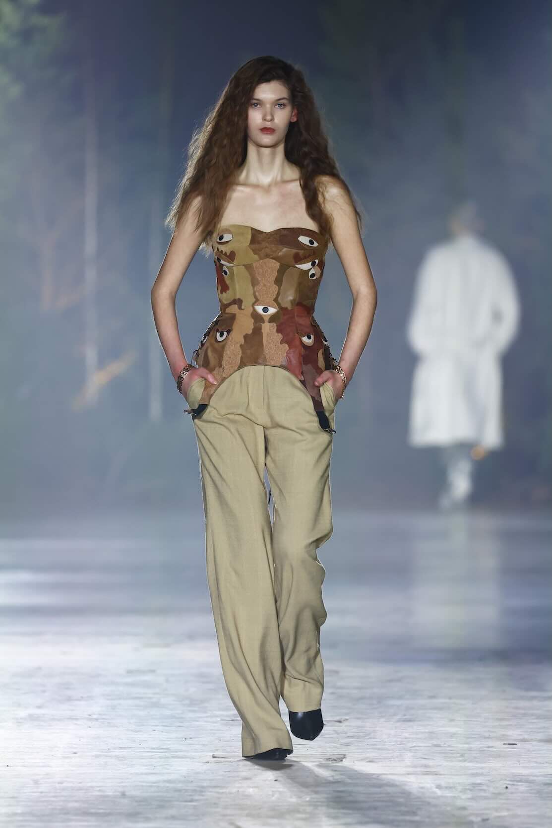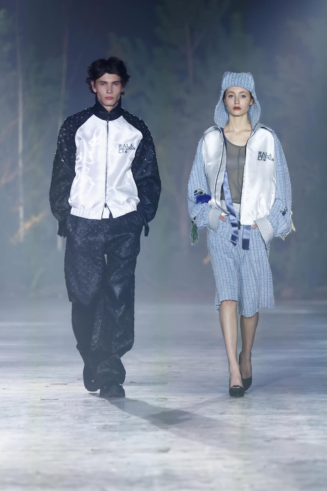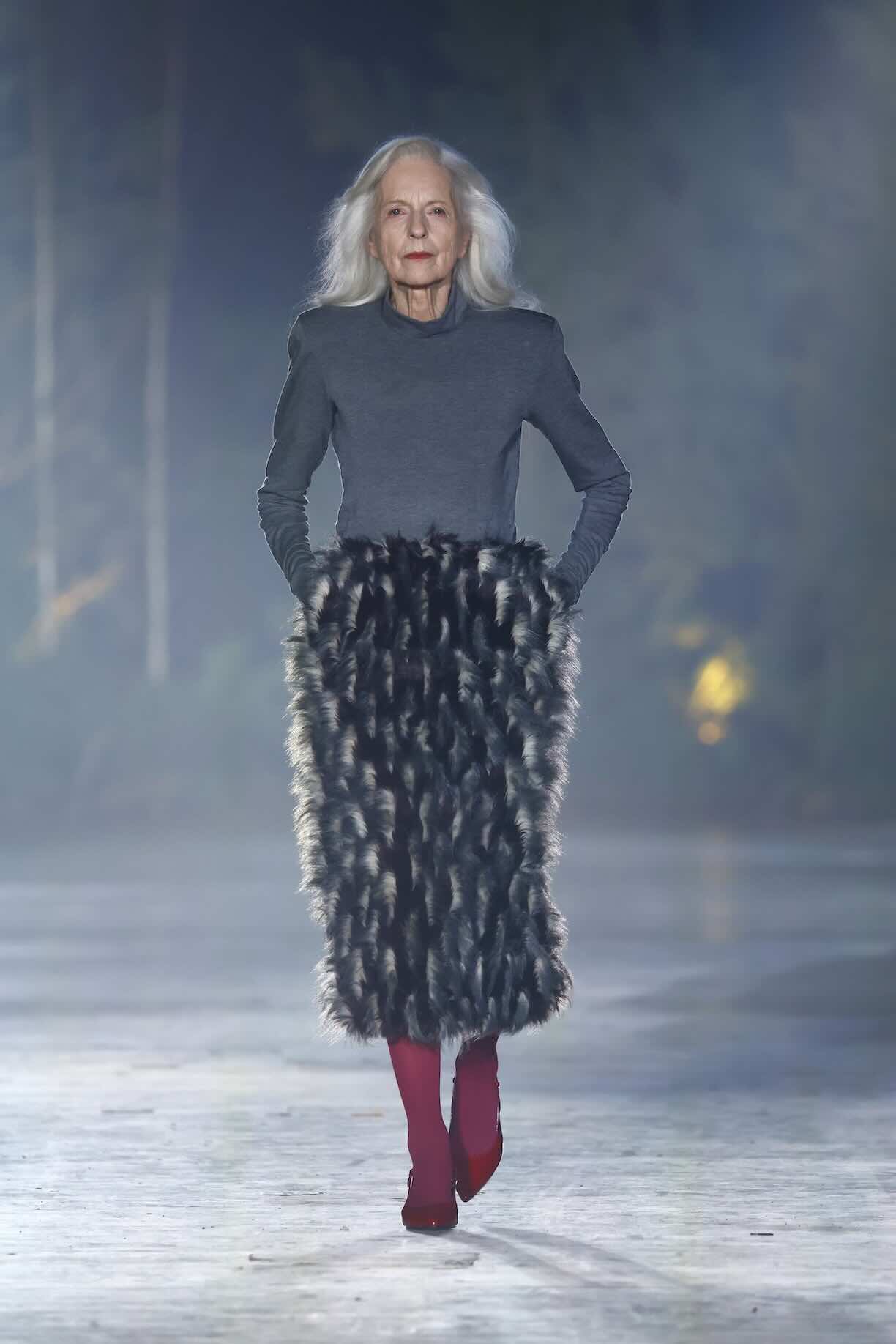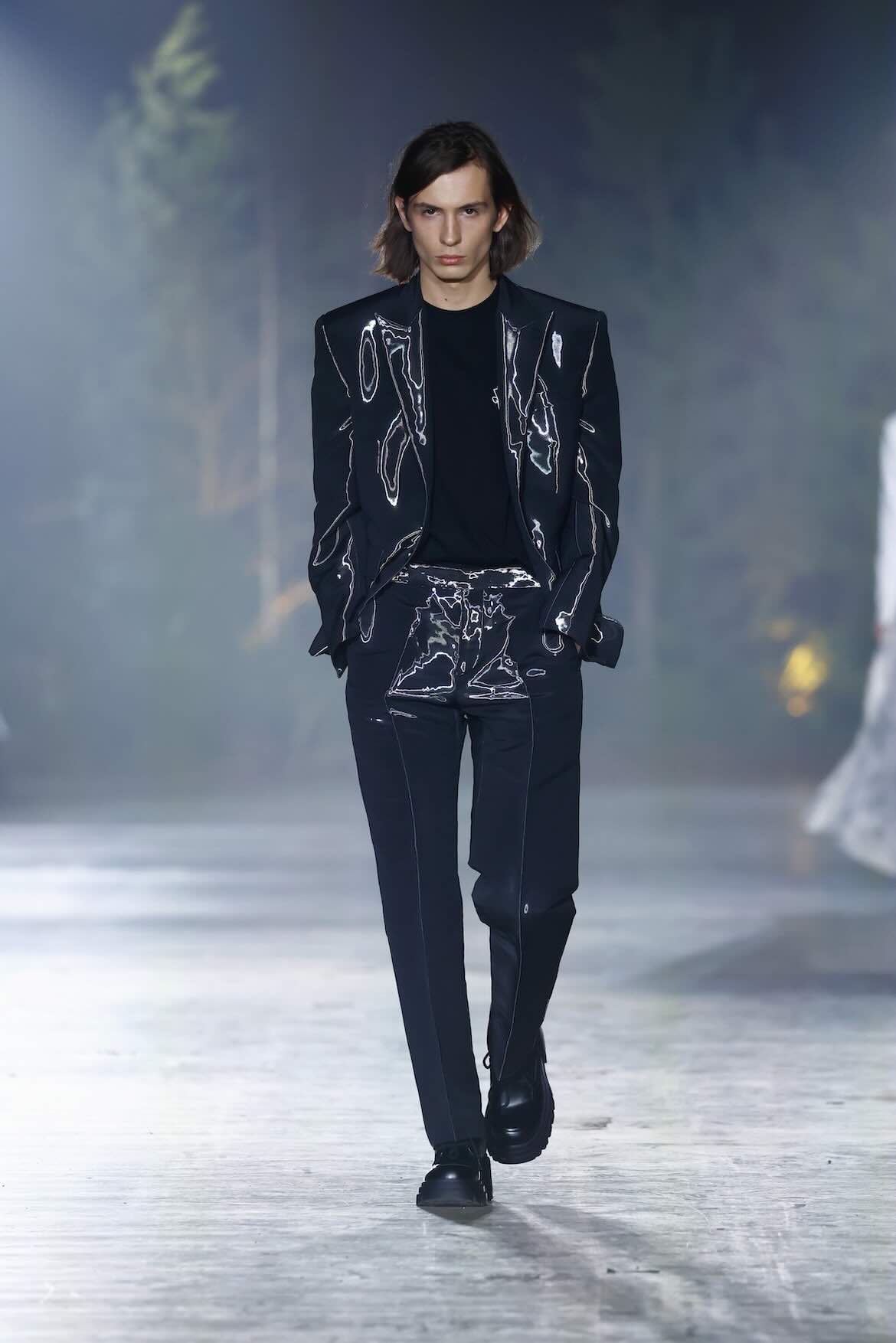 Die Entwürfe bewegen sich zwischen Prêt-à-Couture und skulpturaler Modekunst. Volumenreiche Mäntel, fließende Kleider und Ensembles aus Fake Fur und Schurwolle wirken wie schützende Hüllen – kraftvoll und zugleich verletzlich. Lange Linien treffen auf fragmentierte Formen, Struktur auf Weichheit. Manche Looks scheinen beinahe lebendig, als würden sie sich langsam aus dem Dunkel lösen.