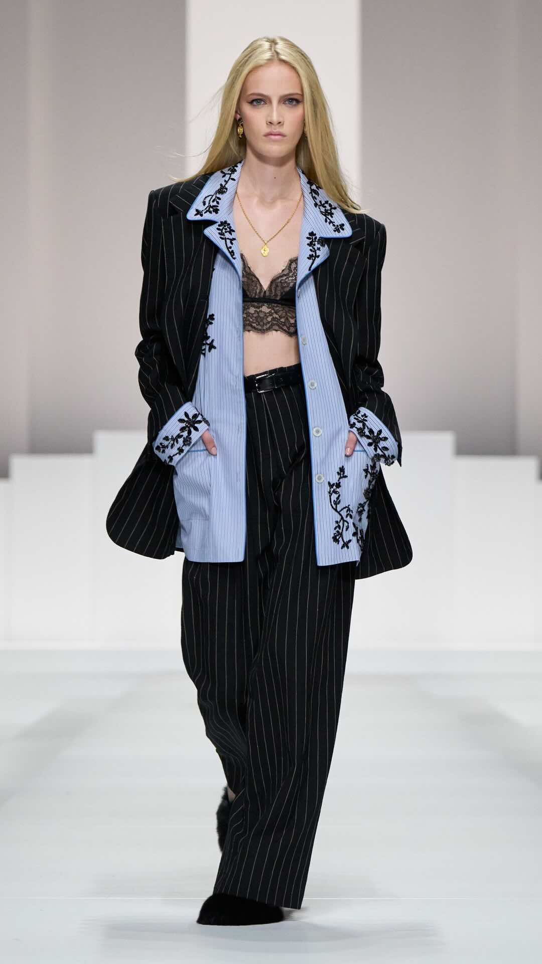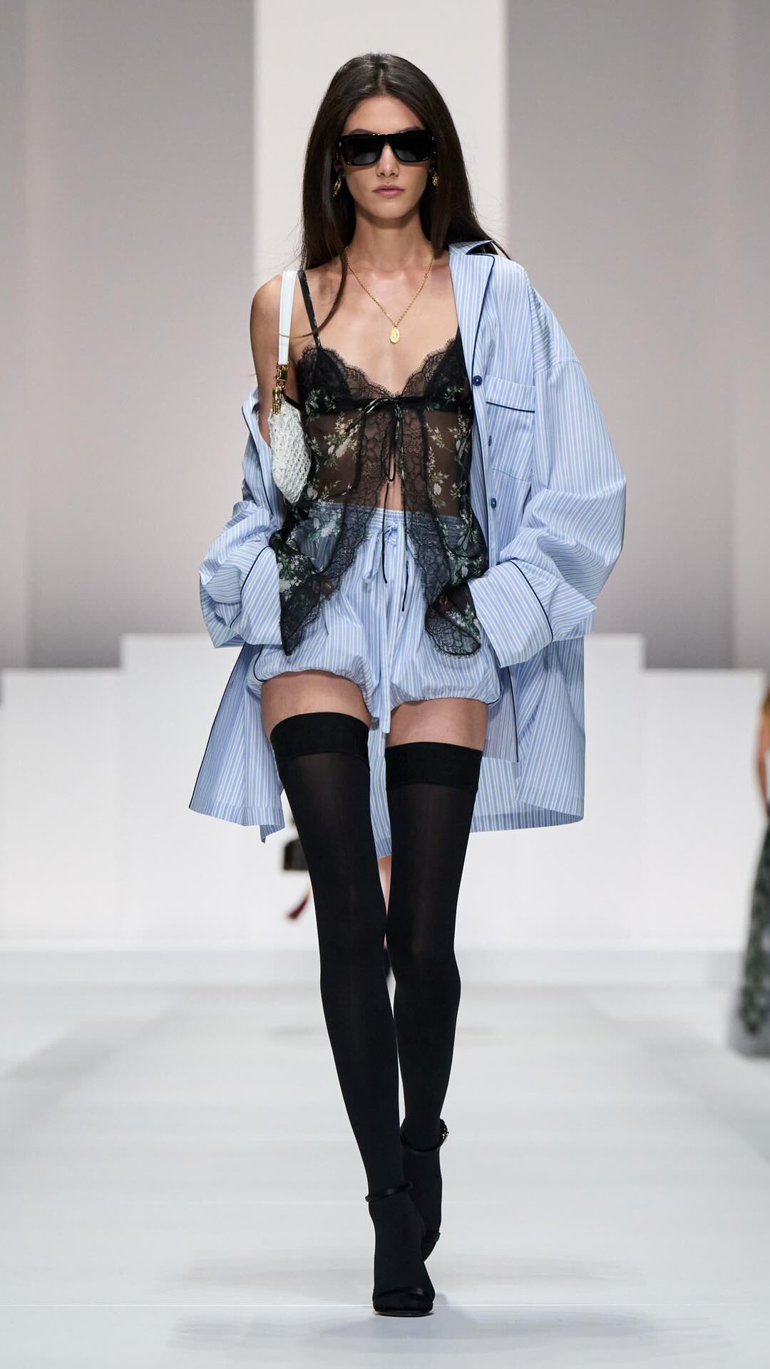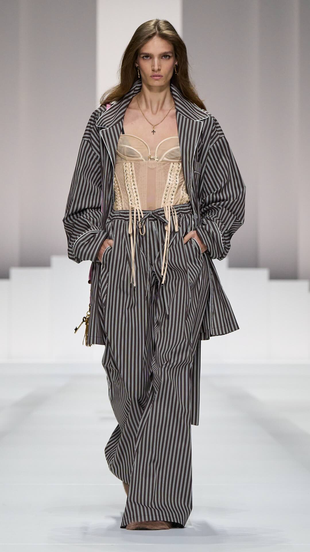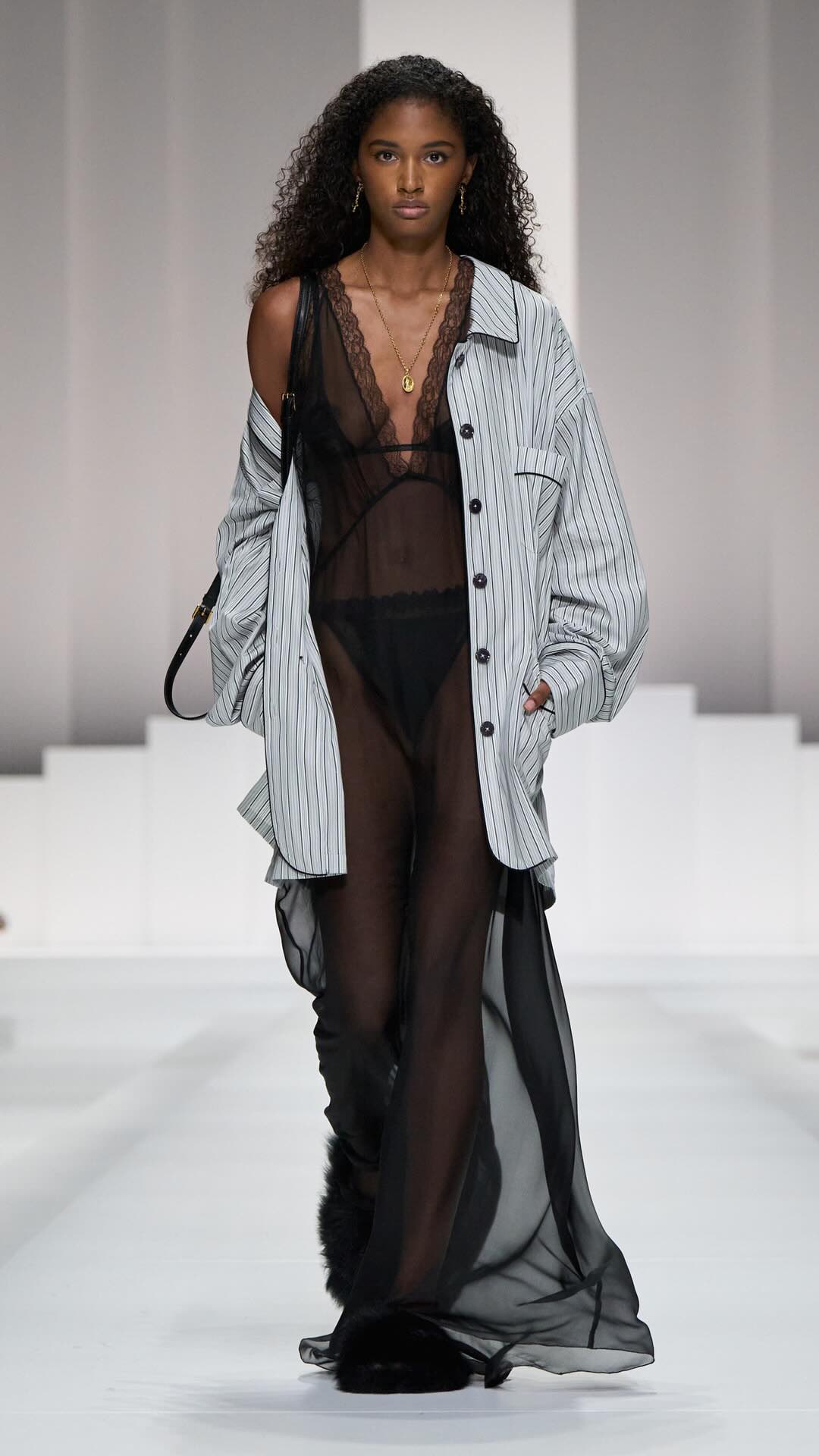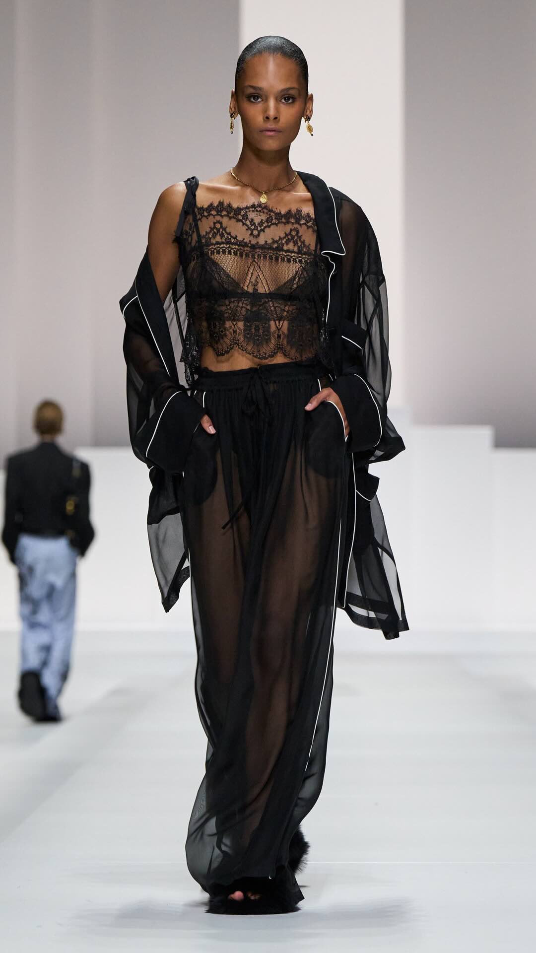 Im Zentrum: zarte Spitze, Corsagen und transparente Stoffe, kombiniert mit maskulin inspirierten Pyjama-Silhouetten. Tagsüber weich und leicht, mit feinen Stickereien und sanften Nuancen. Am Abend übernimmt Schwarz die Bühne – fließender Chiffon, sinnliche Transparenz und ikonische Details verleihen den Looks eine leise Intensität.