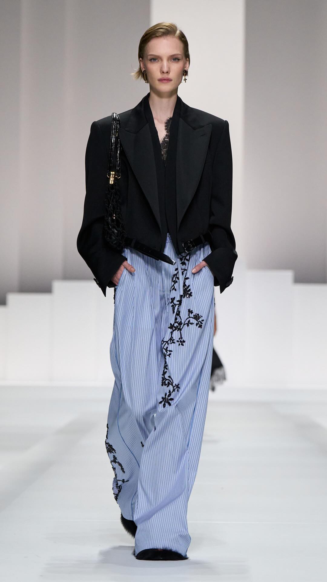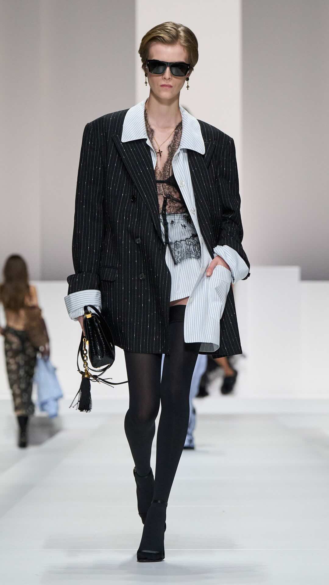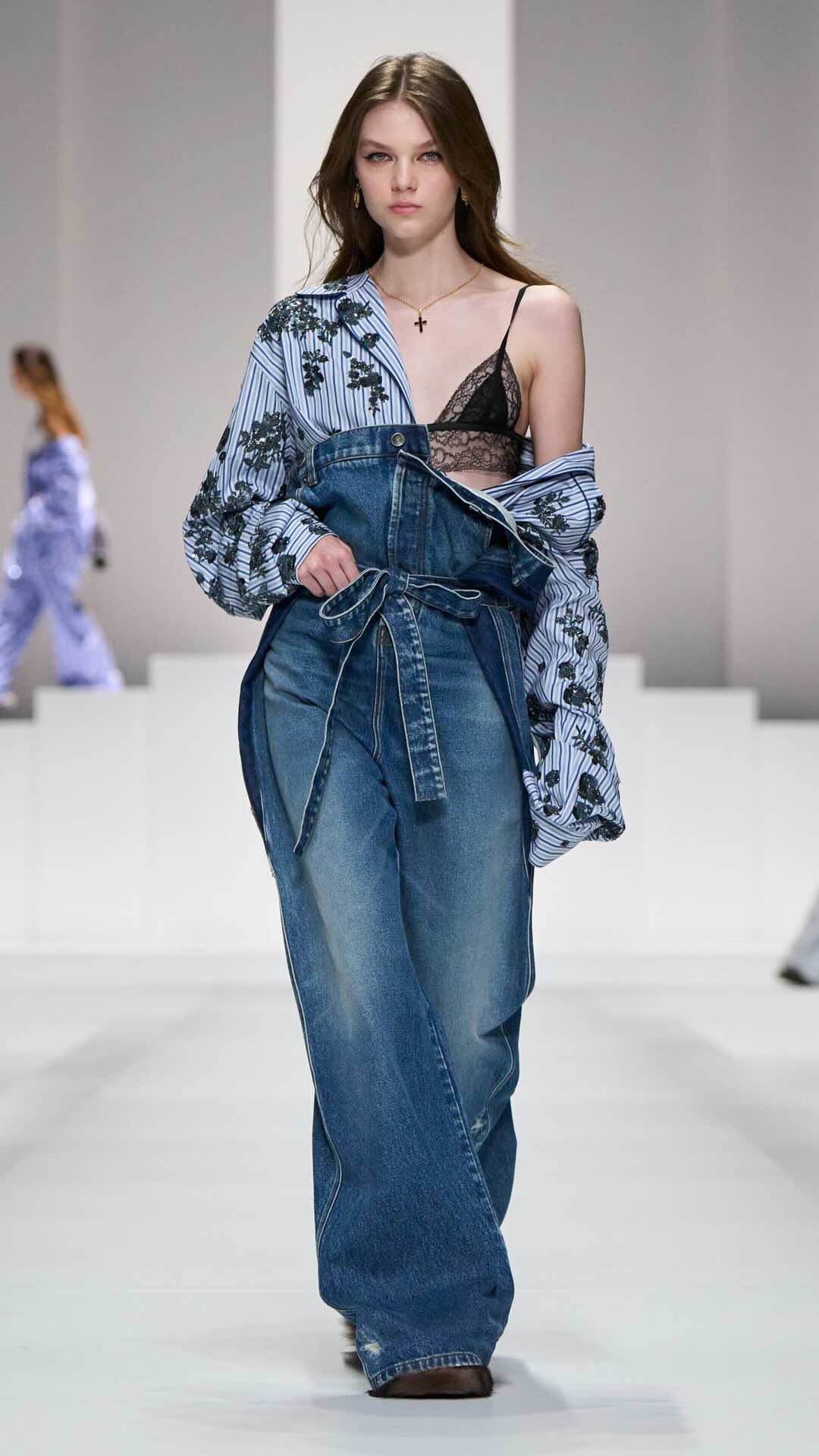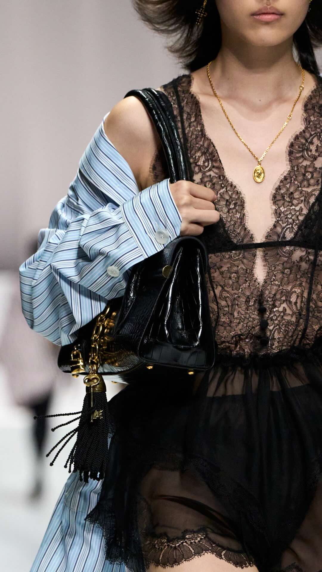 Im Zentrum: zarte Spitze, Corsagen und transparente Stoffe, kombiniert mit maskulin inspirierten Pyjama-Silhouetten. Tagsüber weich und leicht, mit feinen Stickereien und sanften Nuancen. Am Abend übernimmt Schwarz die Bühne – fließender Chiffon, sinnliche Transparenz und ikonische Details verleihen den Looks eine leise Intensität.