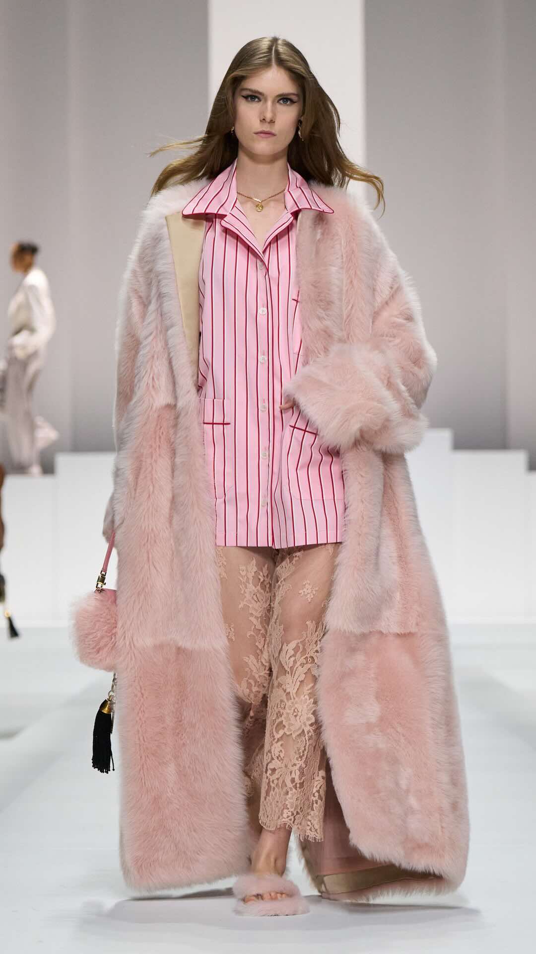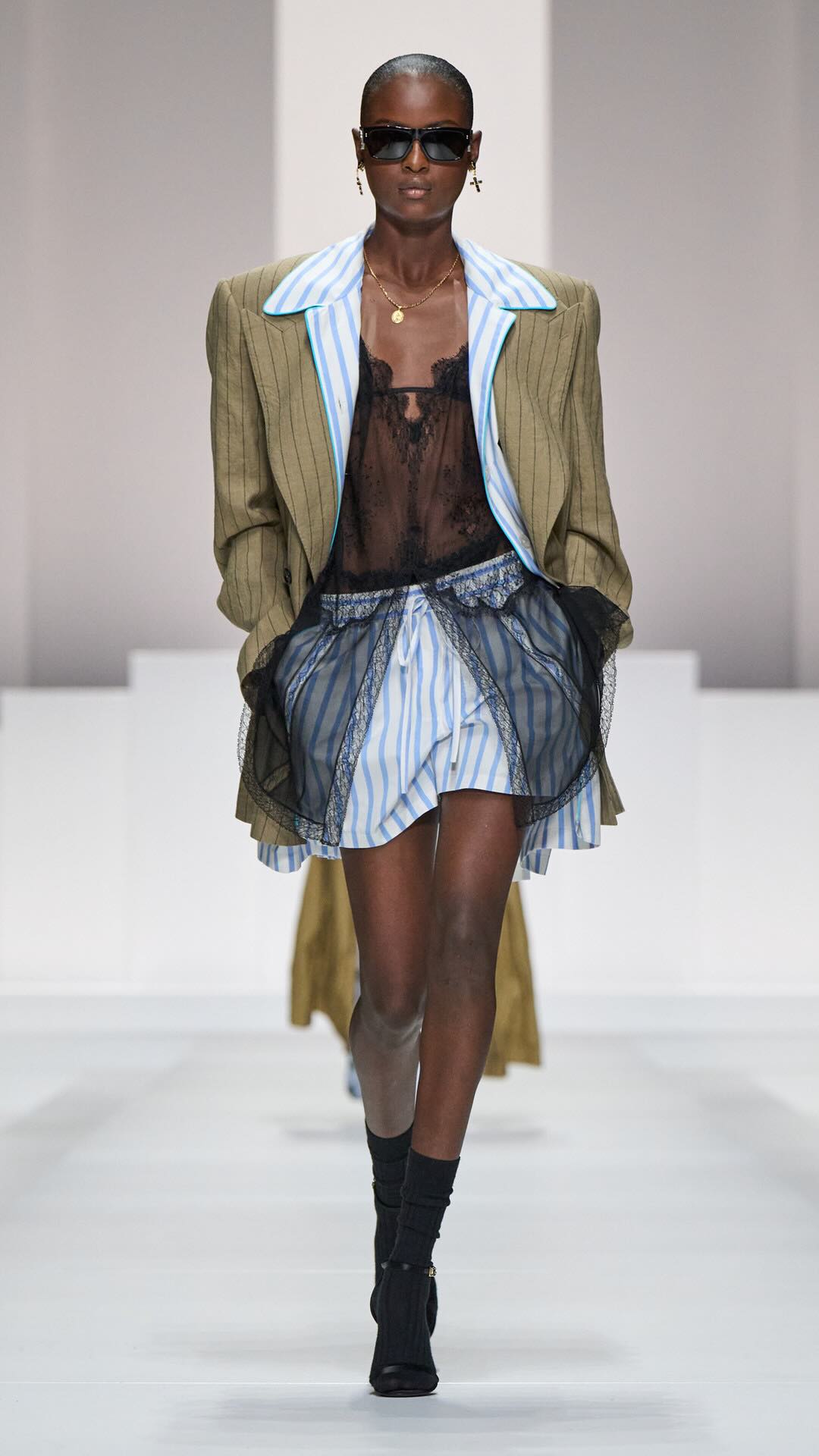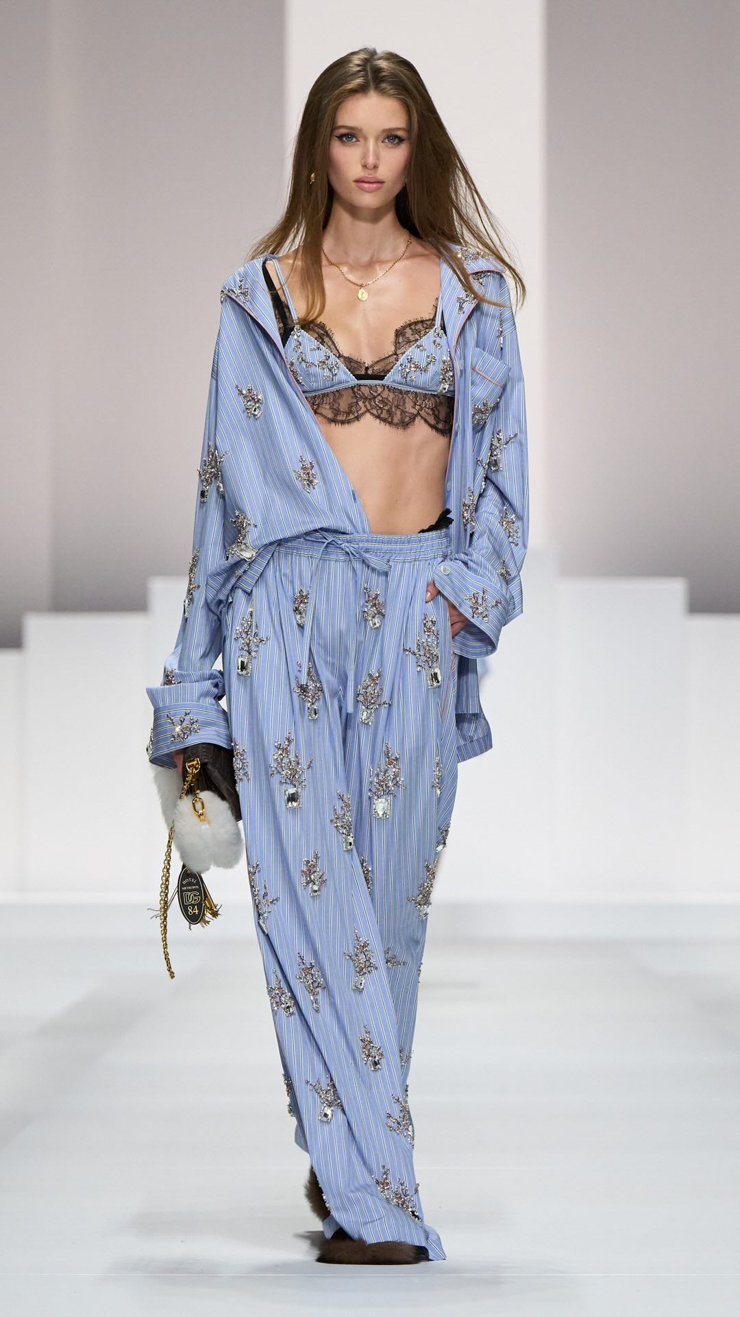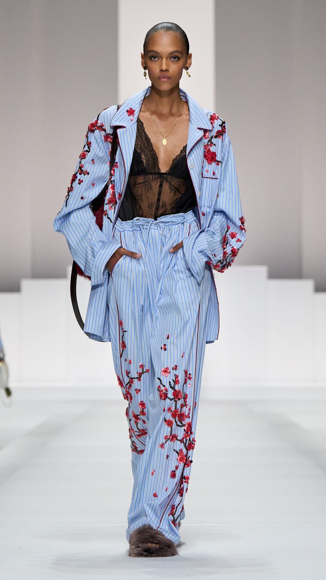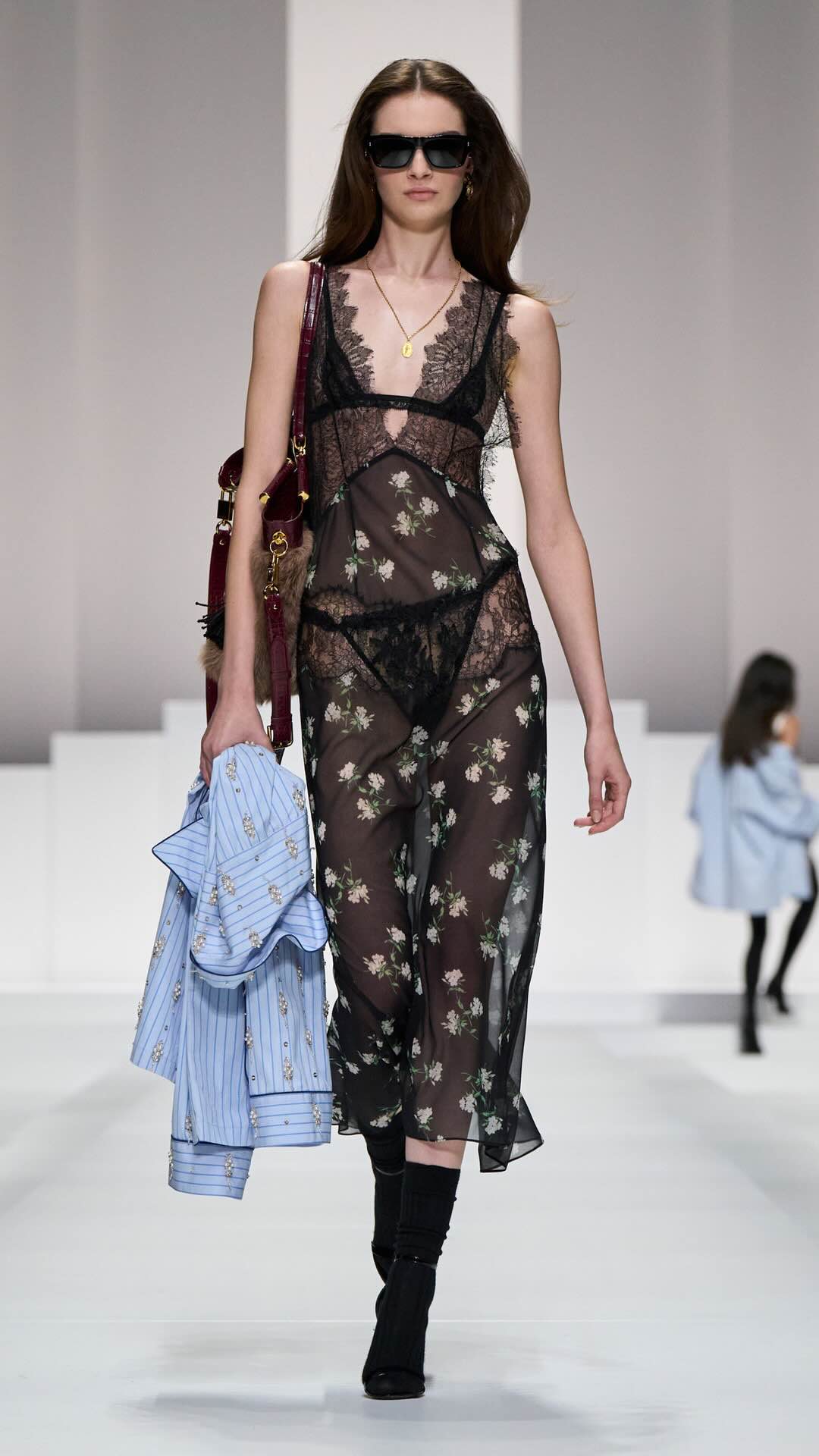 Im Zentrum: zarte Spitze, Corsagen und transparente Stoffe, kombiniert mit maskulin inspirierten Pyjama-Silhouetten. Tagsüber weich und leicht, mit feinen Stickereien und sanften Nuancen. Am Abend übernimmt Schwarz die Bühne – fließender Chiffon, sinnliche Transparenz und ikonische Details verleihen den Looks eine leise Intensität.