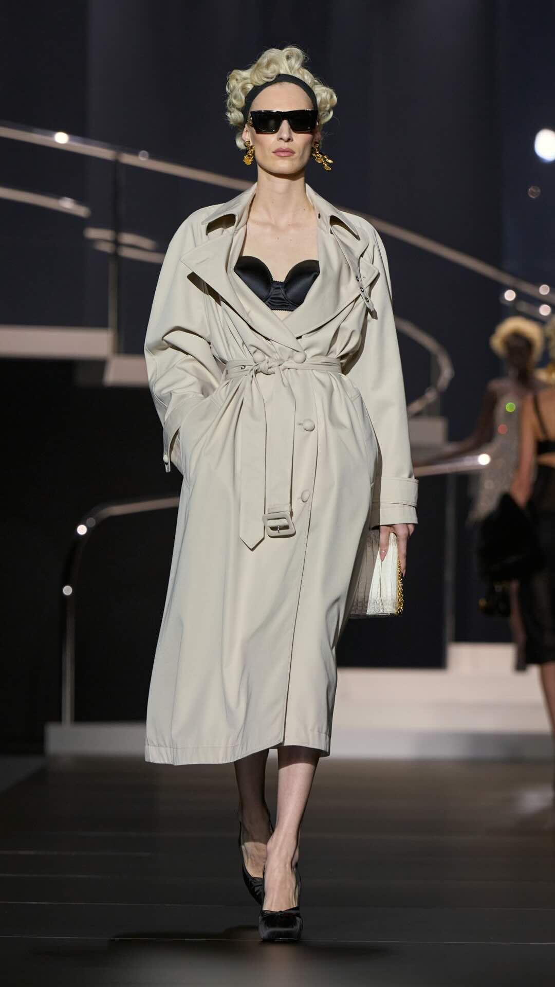 Offenbarte Weiblichkeit steht im Zentrum des Looks: Inspiriert von den 1950er-Jahren rückt der „Bra“ als ikonisches Stilmittel in den Fokus. In Kombination mit transparenter Lingerie, Spitzentops und Korsetts entsteht ein Look, der Stärke und Raffinesse gleichermaßen verkörpert – ergänzt durch oversized Trenchcoats und Kleider mit verführerischem Schlitz.