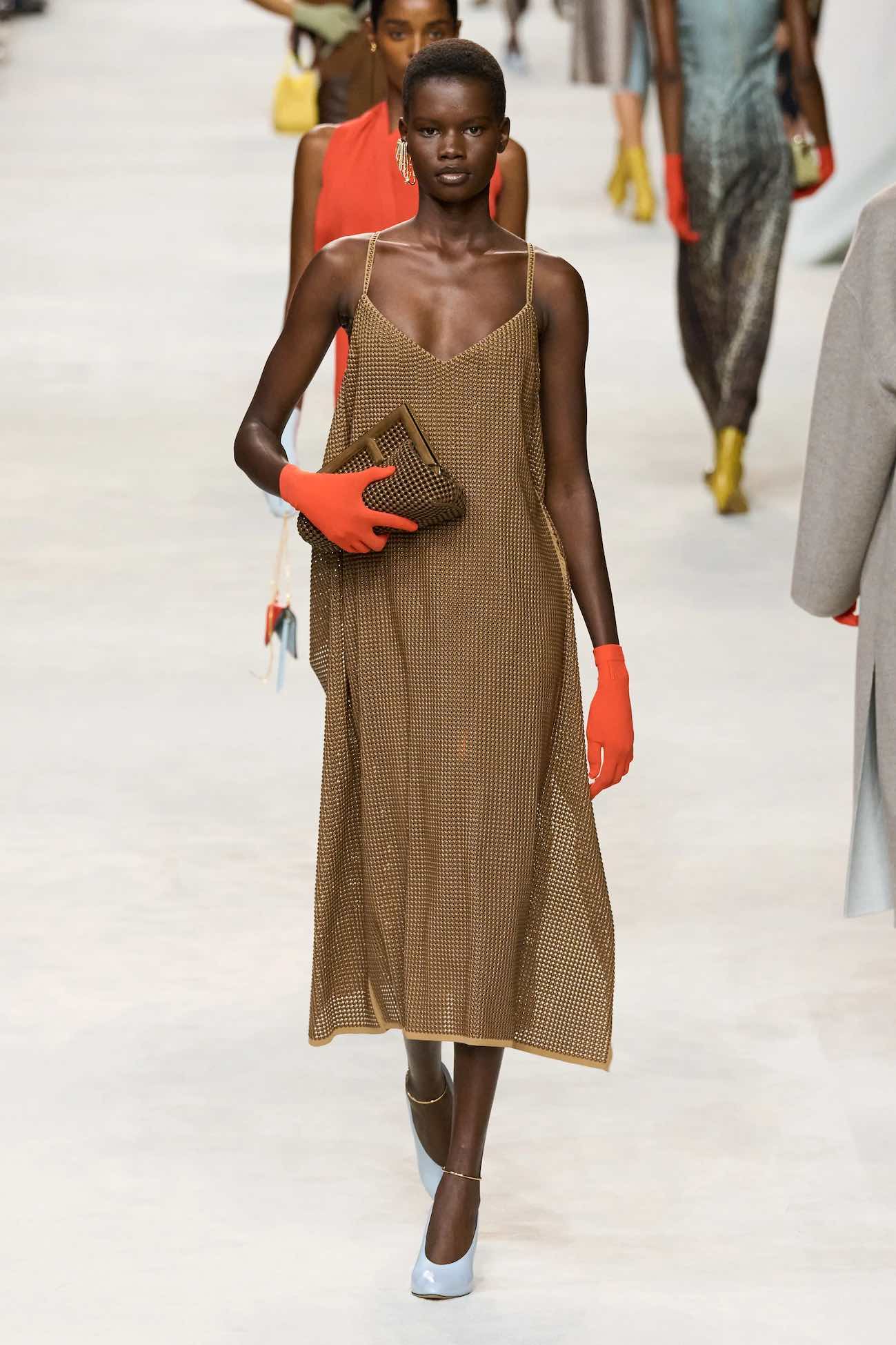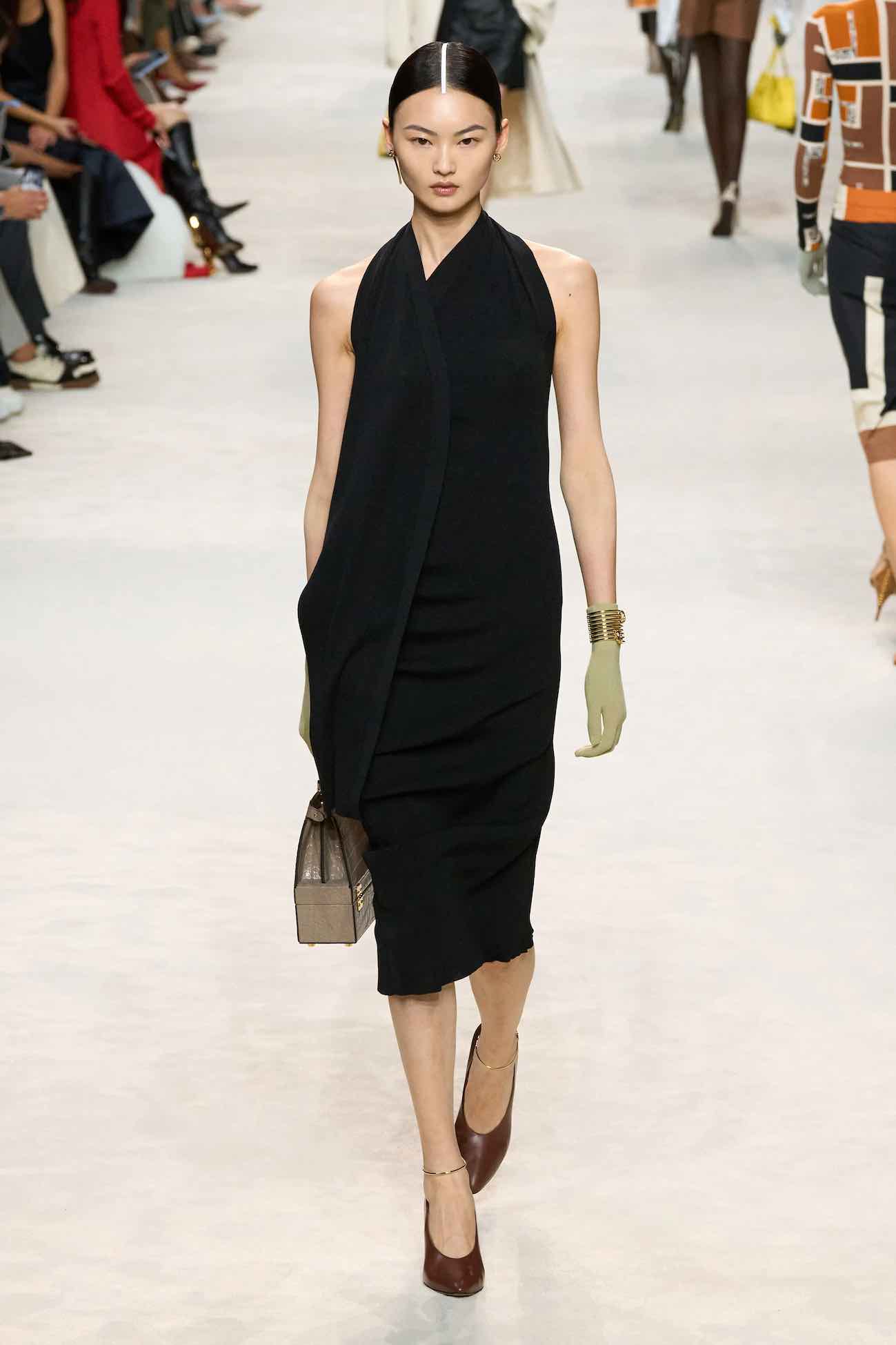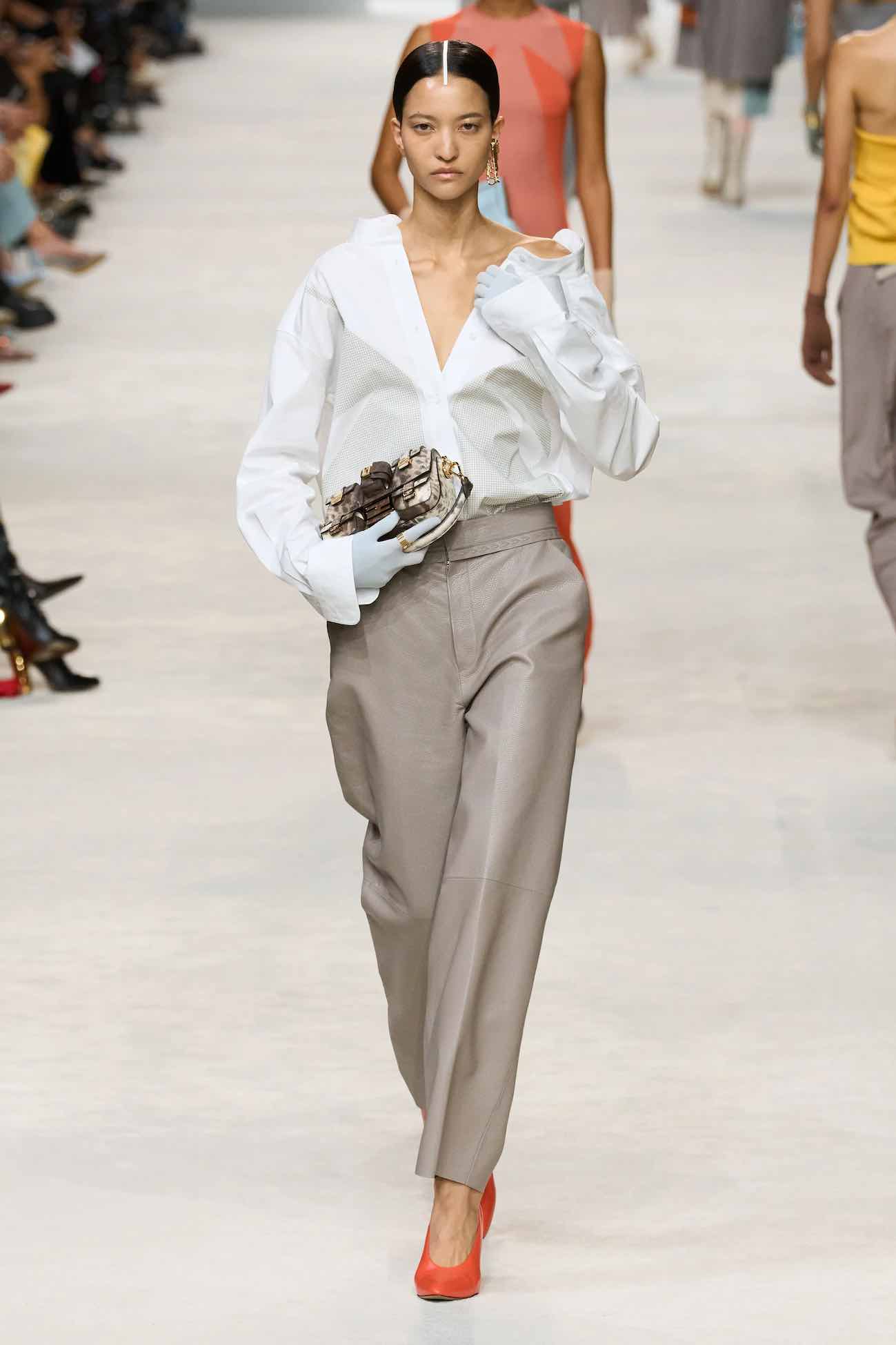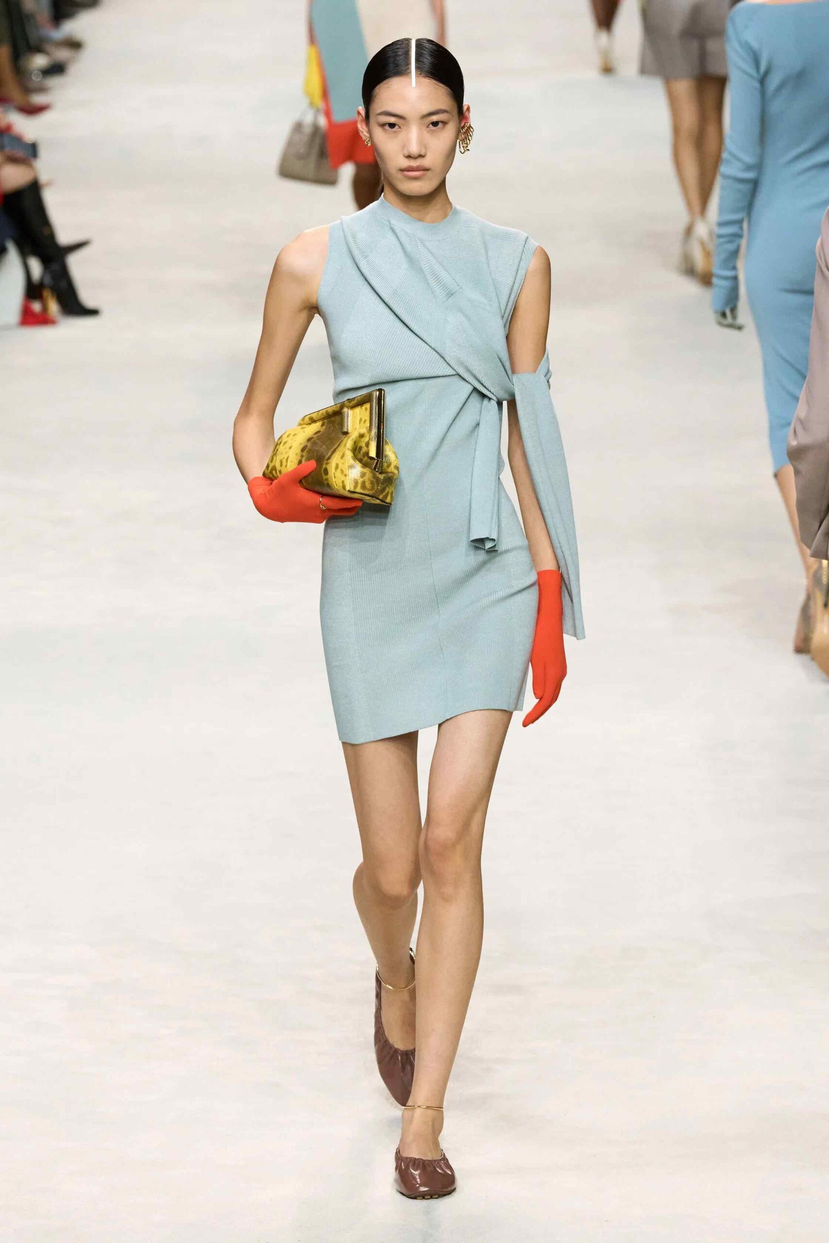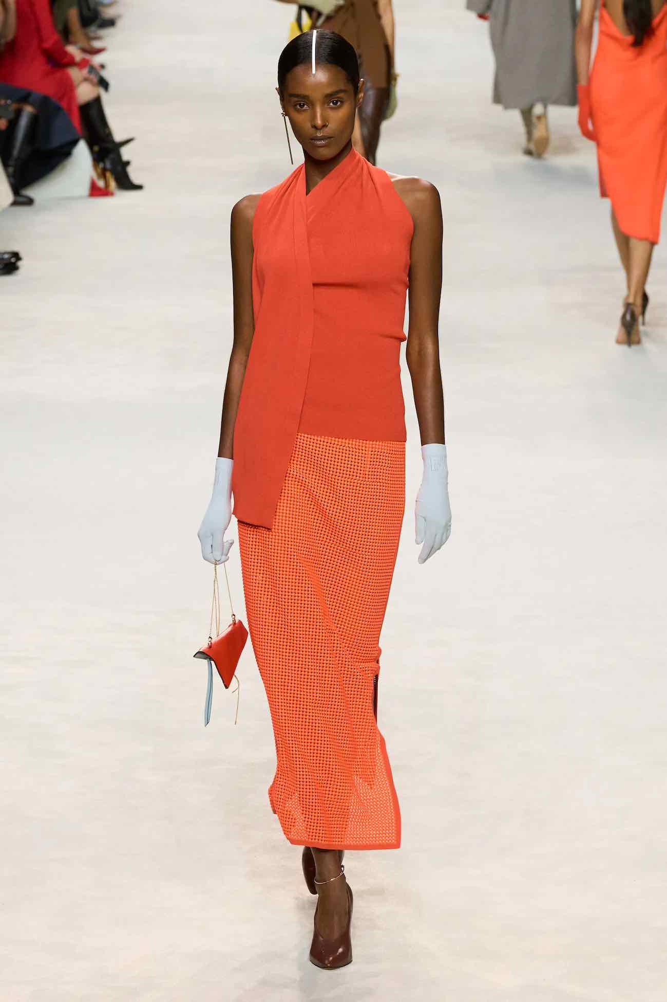 Kim Jones lies sich für die Frühjahr/Sommer-Kollektion 2024 von den antiken Ruinen und der Architektur Roms inspirieren. Statuenhafte Silhouetten in Blau- und Grautönen gemixt mit Orange, Gelb und Braun dominieren die Kollektion. Strick und Seide umhüllten sanft und locker die Körper der Models.
