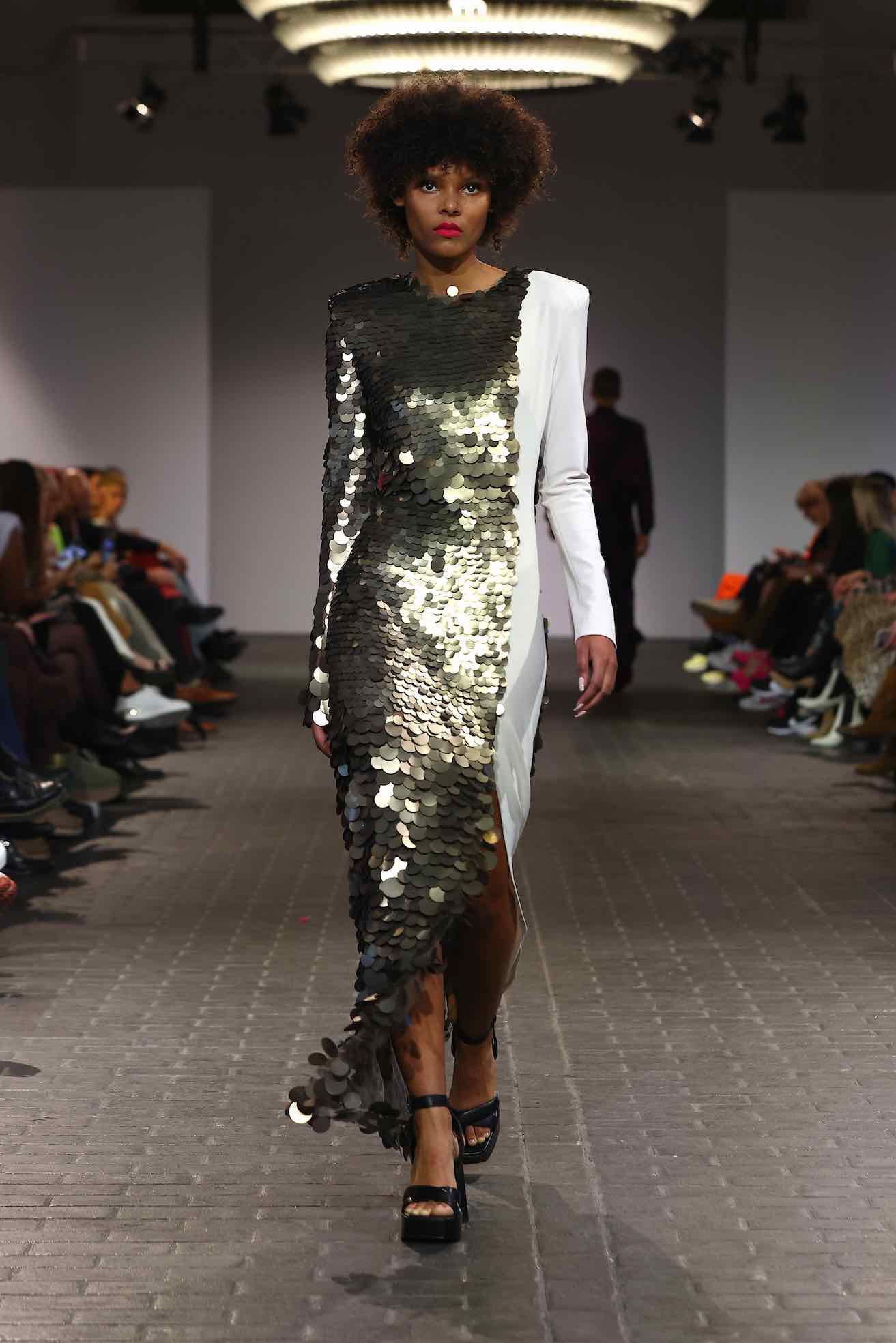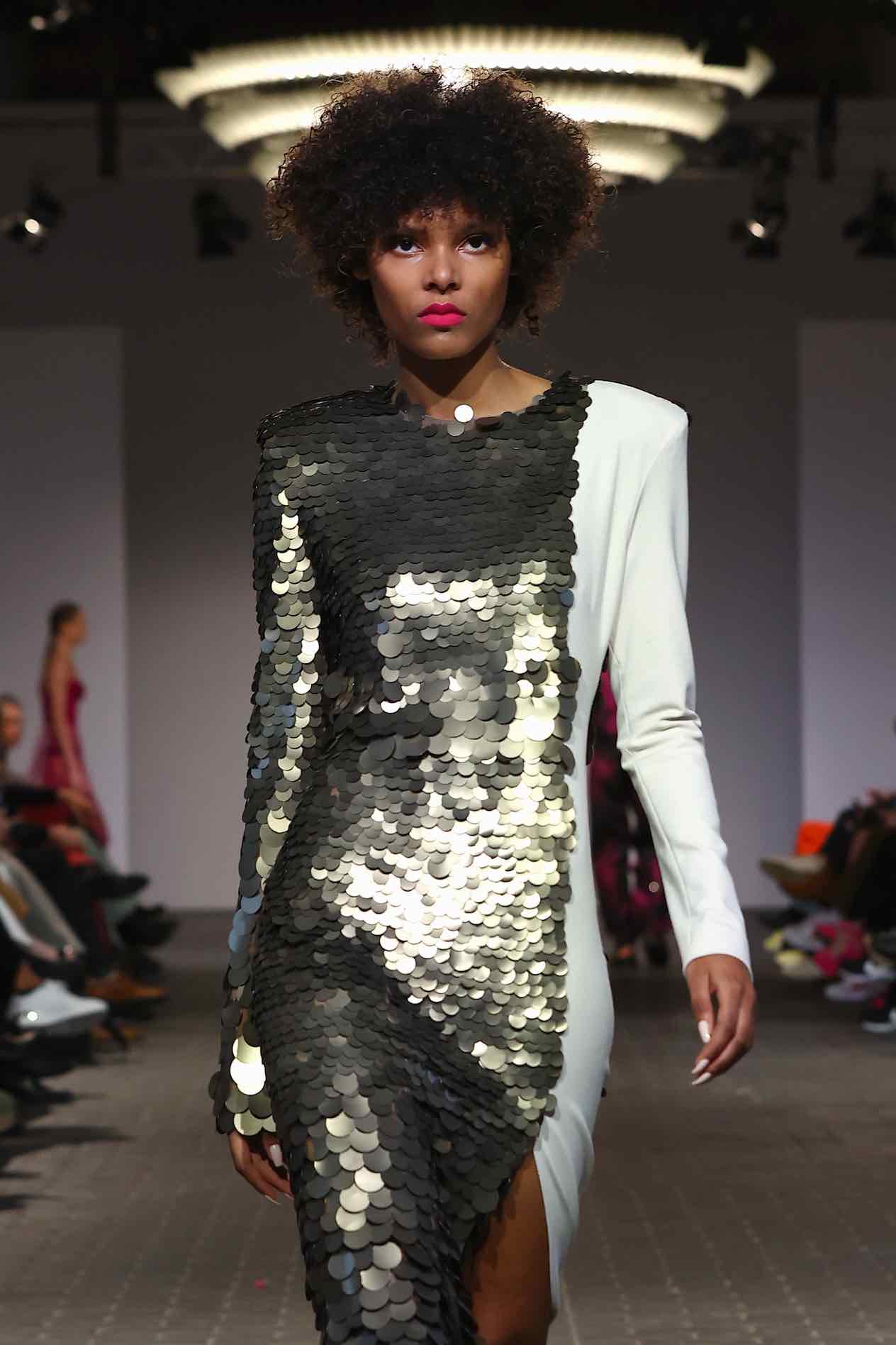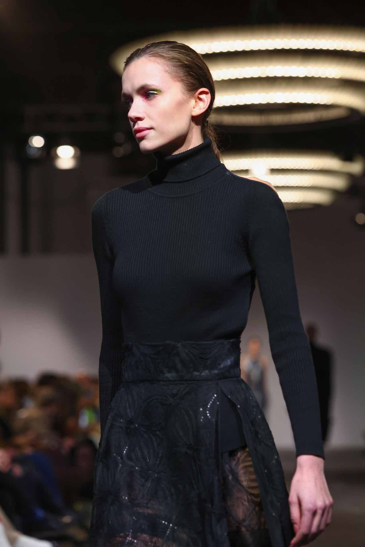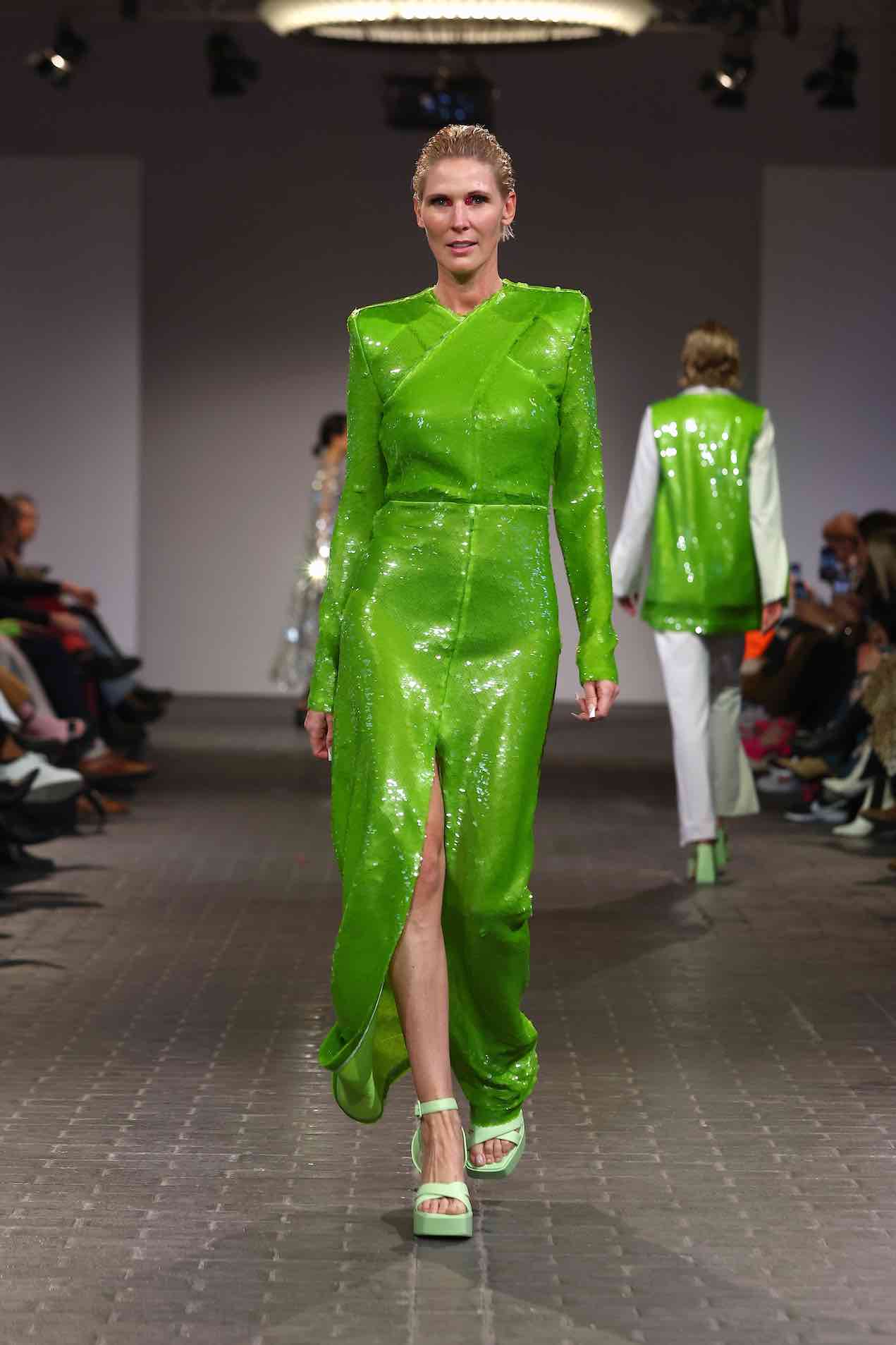 So atemberaubend wie die Länge des Laufstegs waren auch die 52 Looks, die unterstützt von der fulminanten Live-Performance der Berliner Band Fuffifufzich darüber schwebten. 39 Damen- und 13 Männer-Looks präsentierten einen progressiven Mix aus Evening-Wear und Streetstyle.