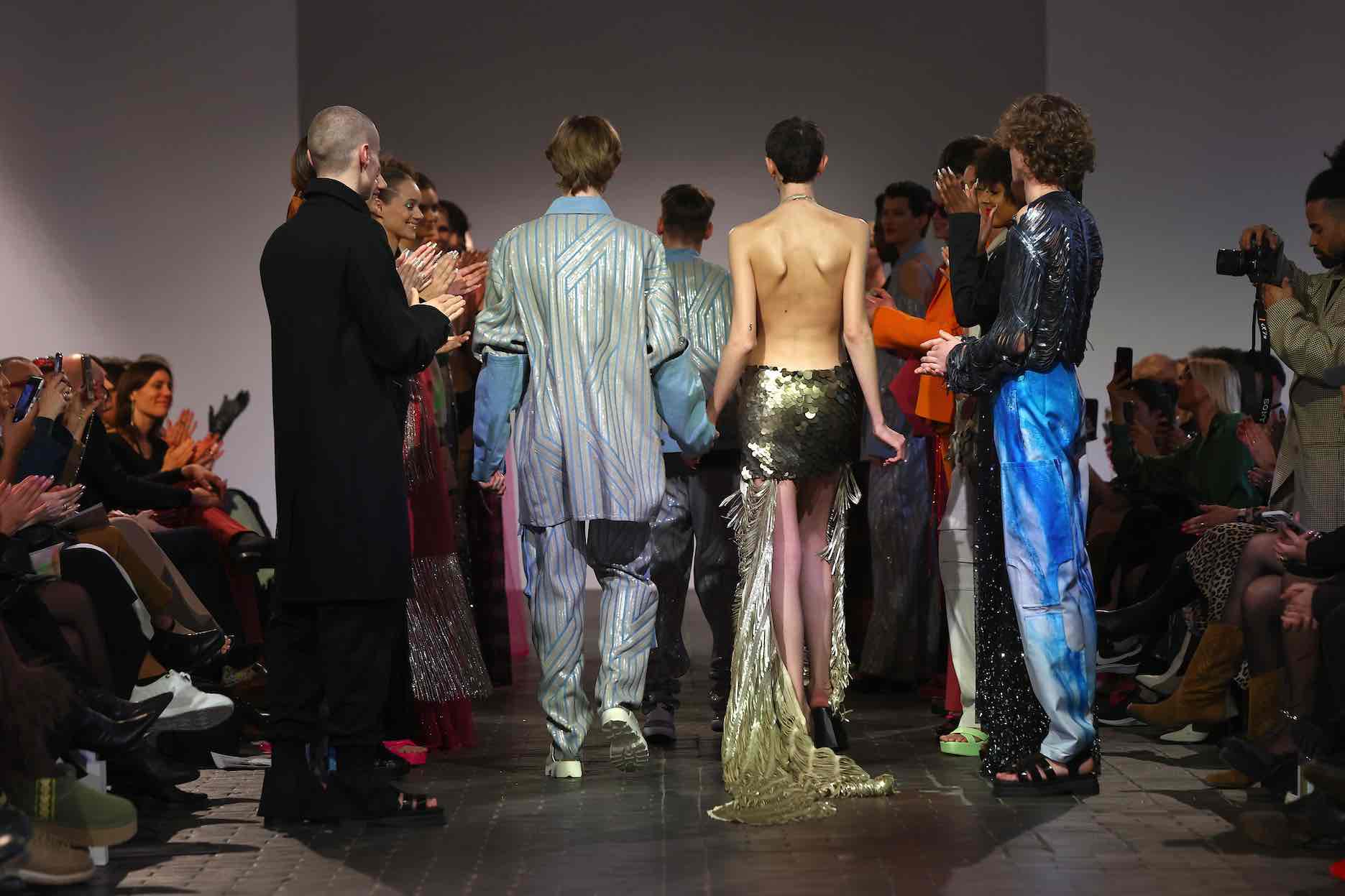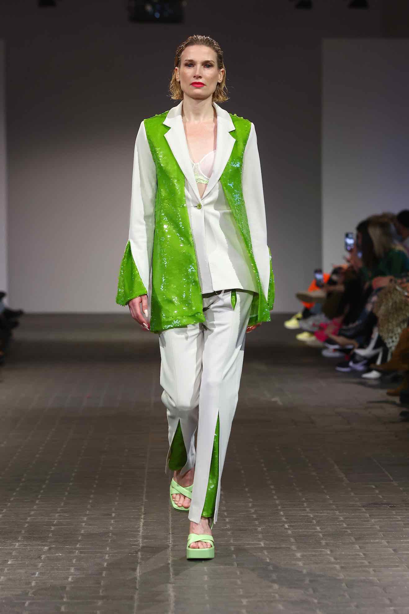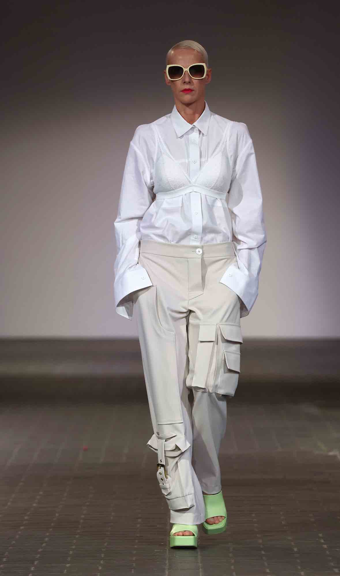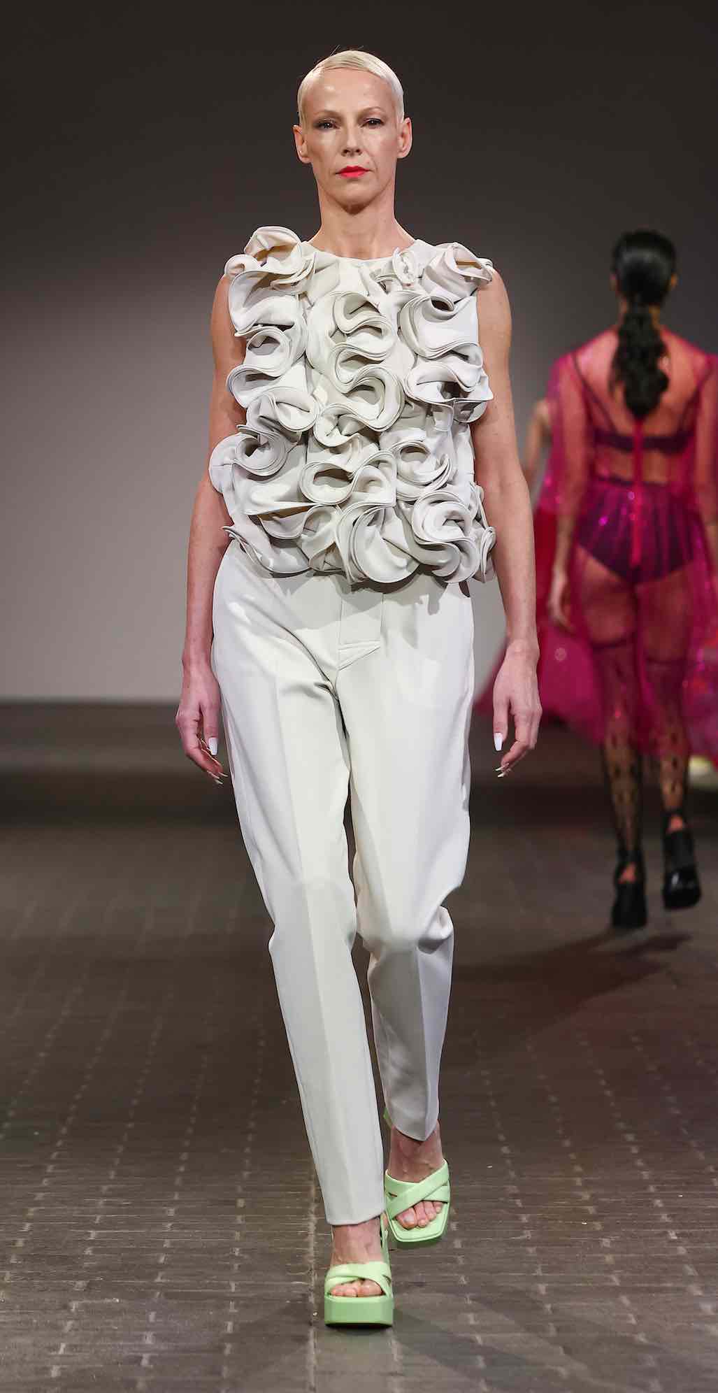 So atemberaubend wie die Länge des Laufstegs waren auch die 52 Looks, die unterstützt von der fulminanten Live-Performance der Berliner Band Fuffifufzich darüber schwebten. 39 Damen- und 13 Männer-Looks präsentierten einen progressiven Mix aus Evening-Wear und Streetstyle.