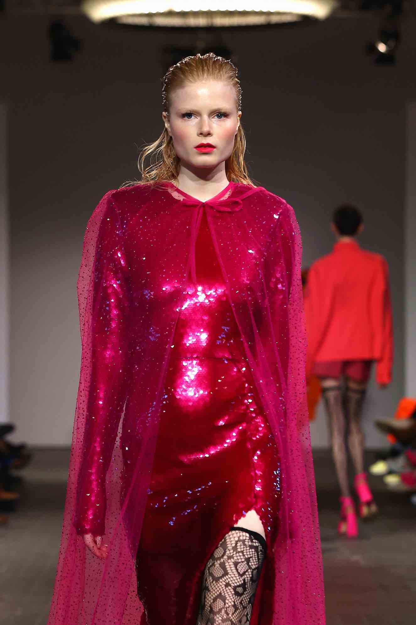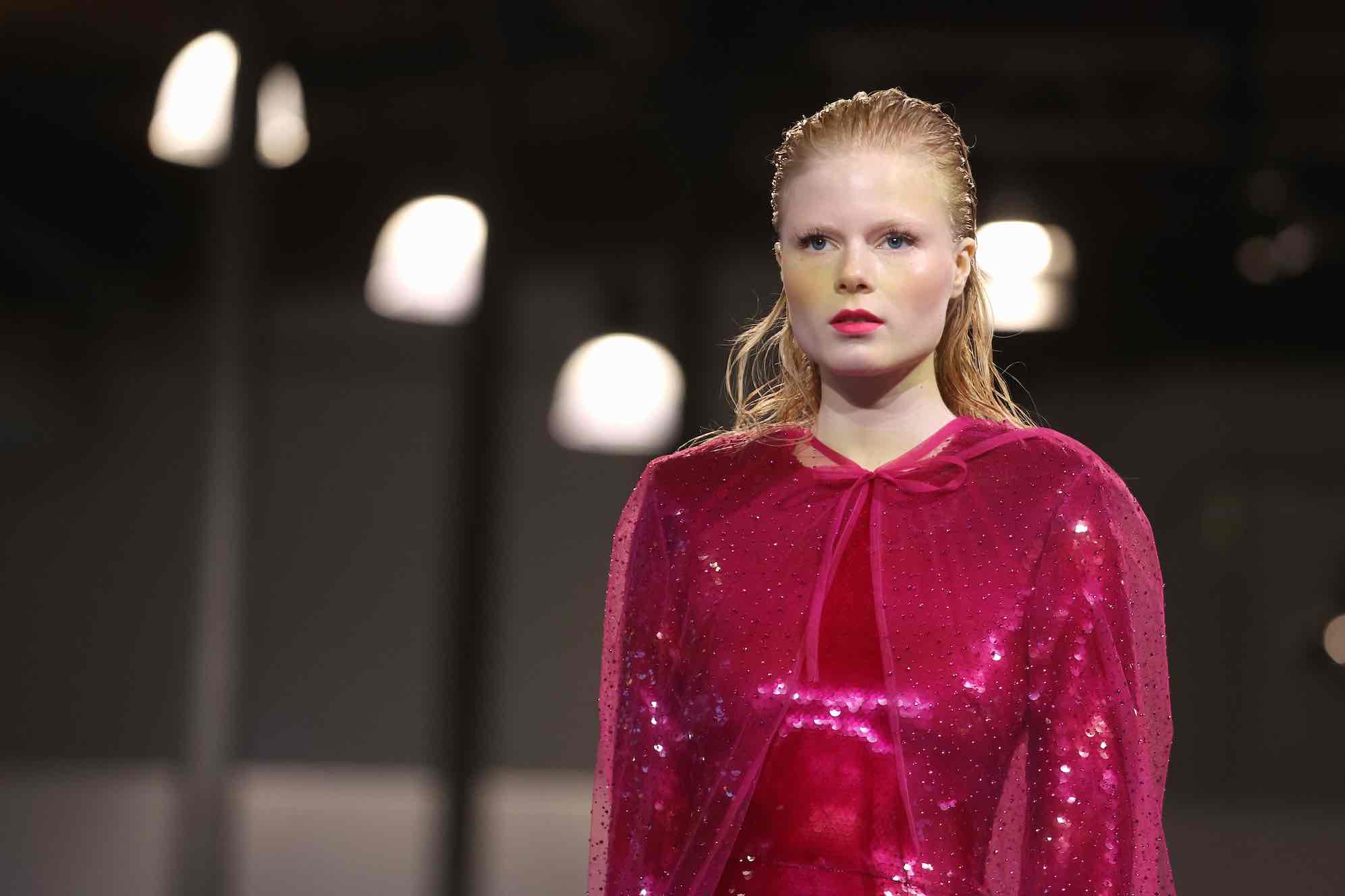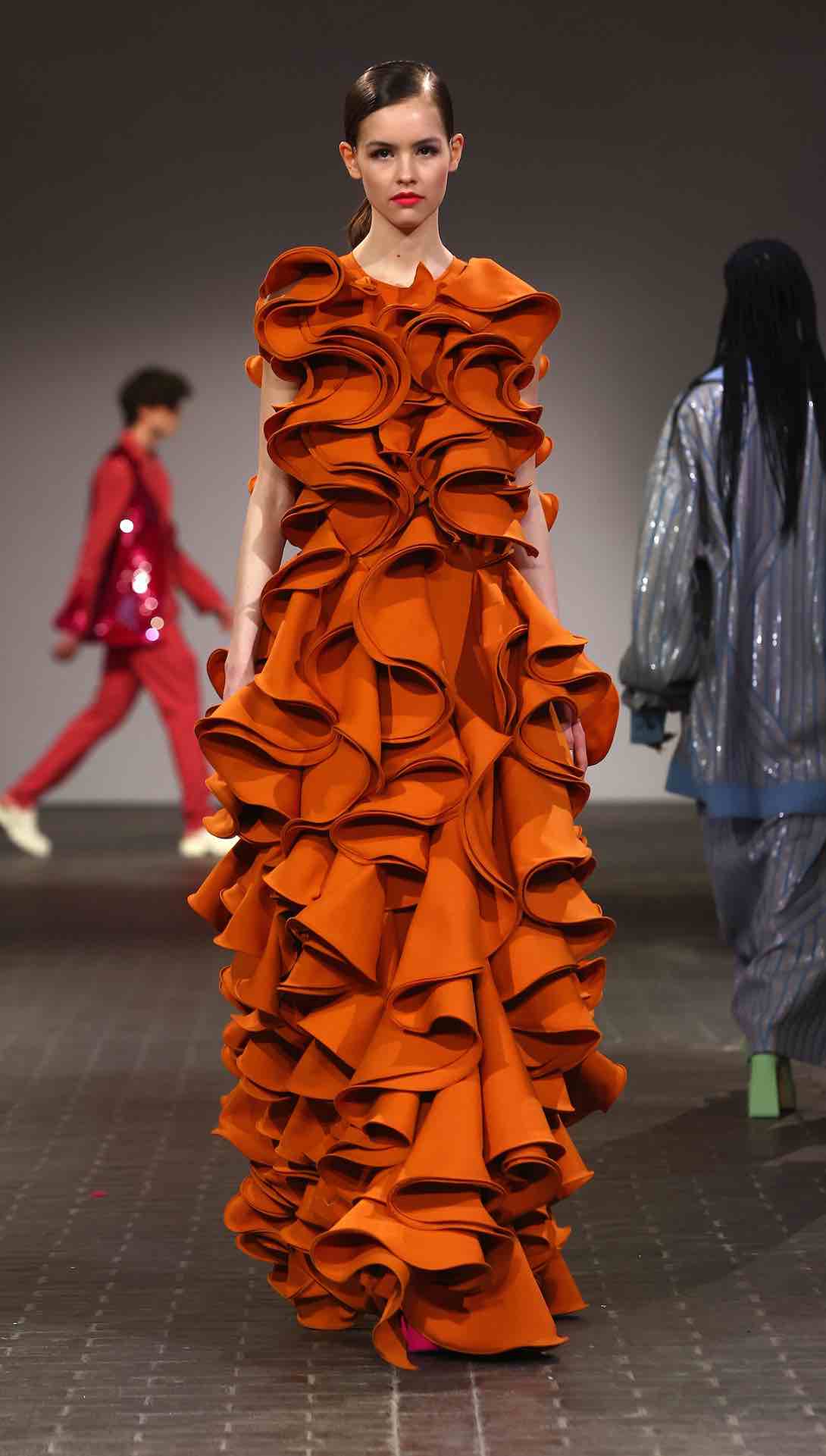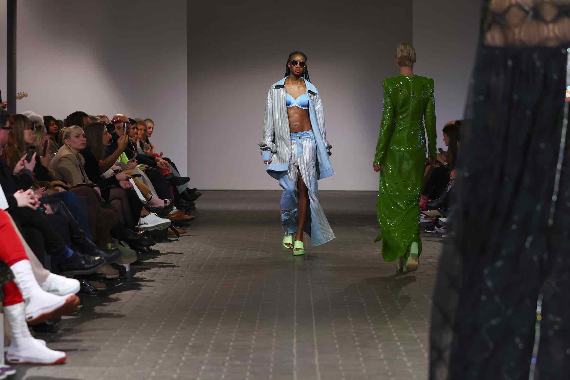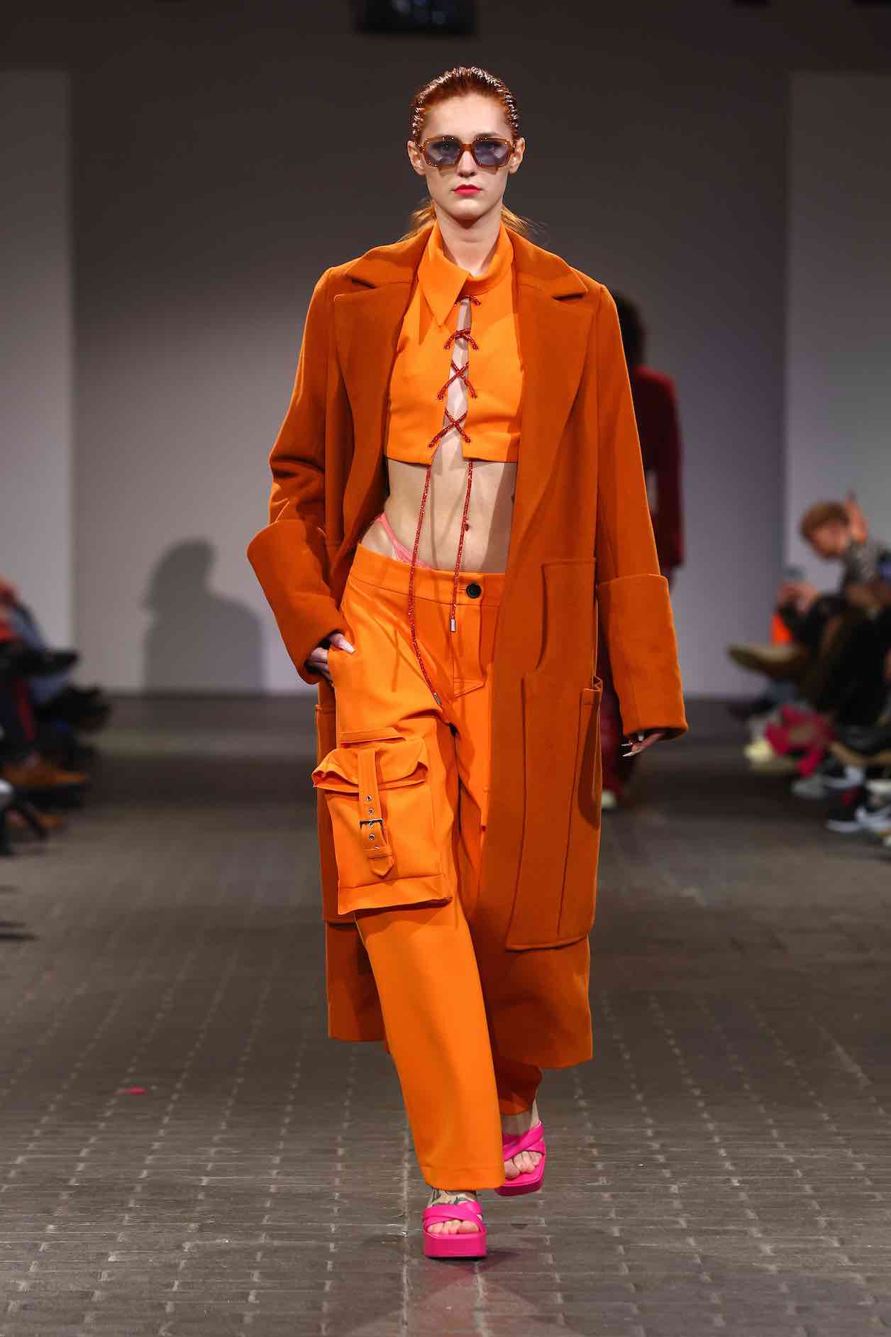 So atemberaubend wie die Länge des Laufstegs waren auch die 52 Looks, die unterstützt von der fulminanten Live-Performance der Berliner Band Fuffifufzich darüber schwebten. 39 Damen- und 13 Männer-Looks präsentierten einen progressiven Mix aus Evening-Wear und Streetstyle.