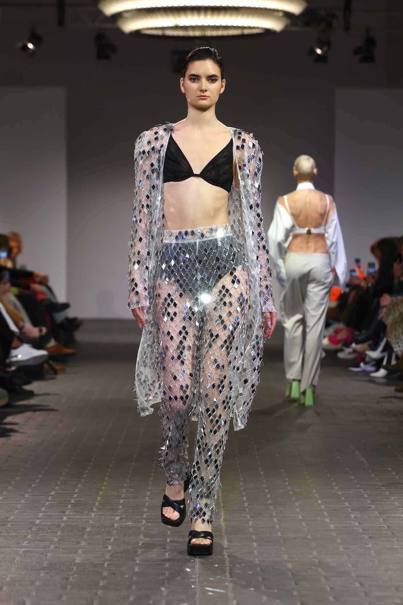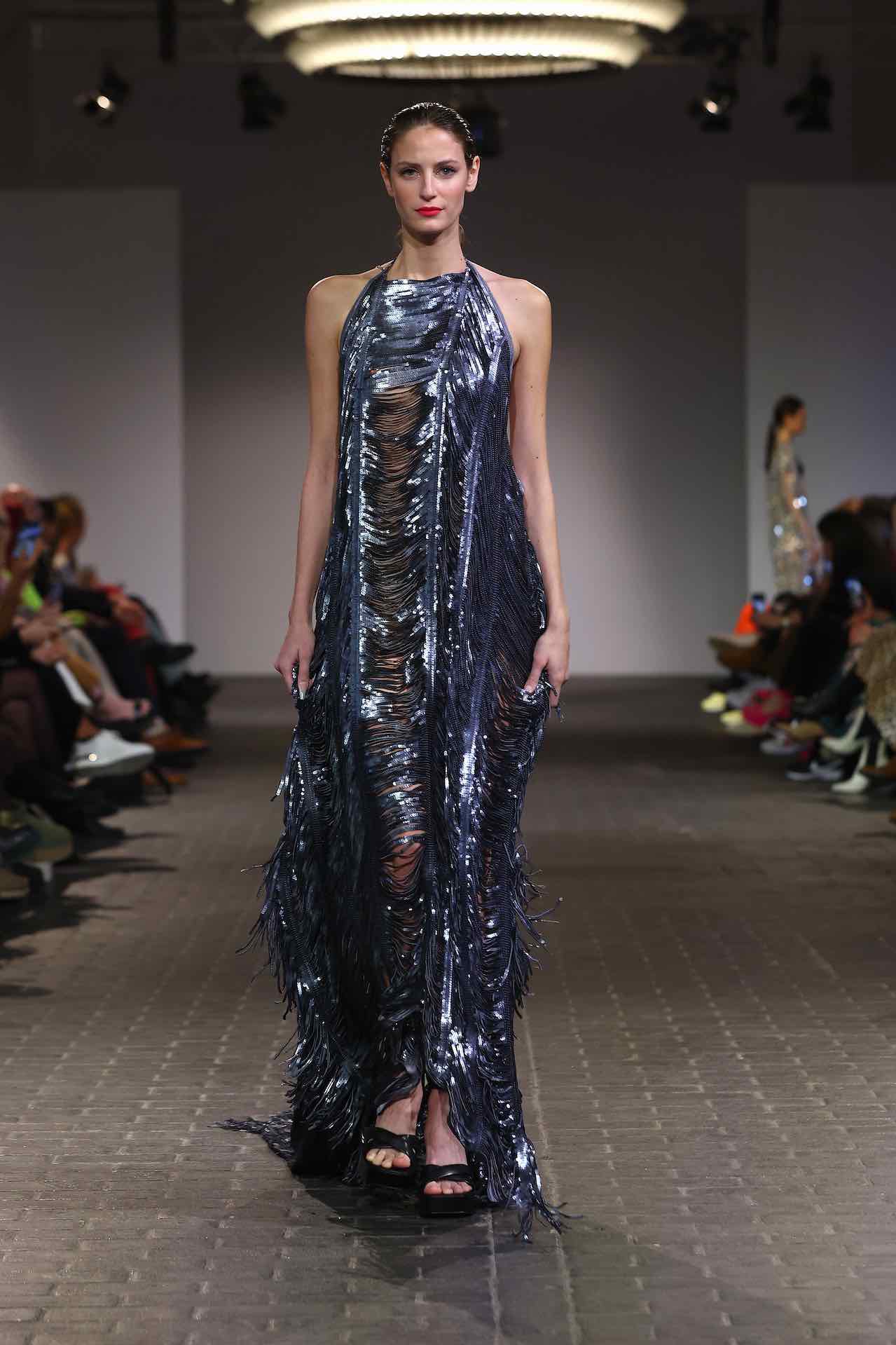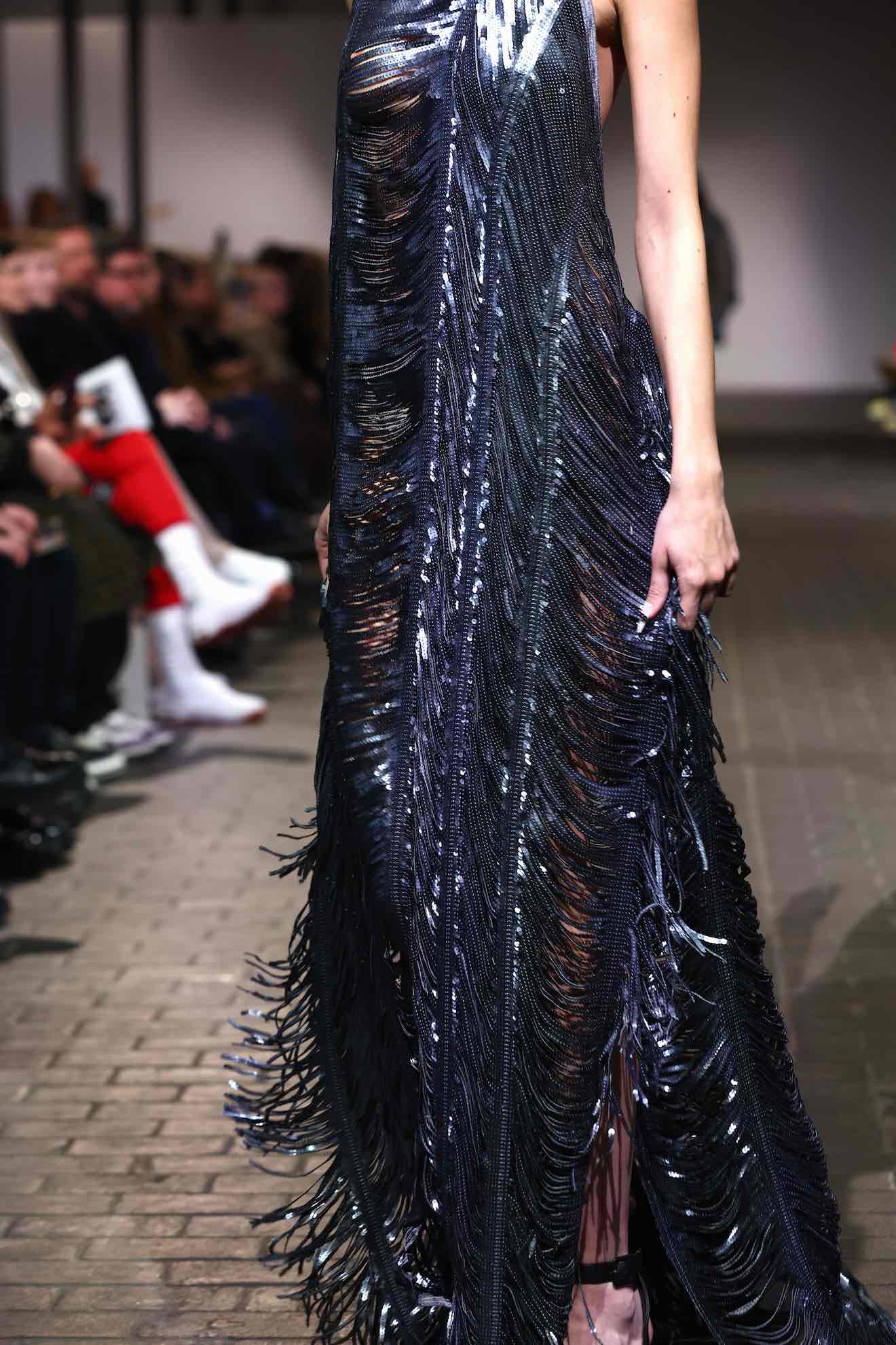In dieser Saison stechen hochwertige Pailletten im Wetlook und auf Denim, Tüll mit Strass, Hosen und Hemden mit Glitzerkordeln sowie verschlossene Stoff-Schlitze und Looks mit Glasplättchen heraus.