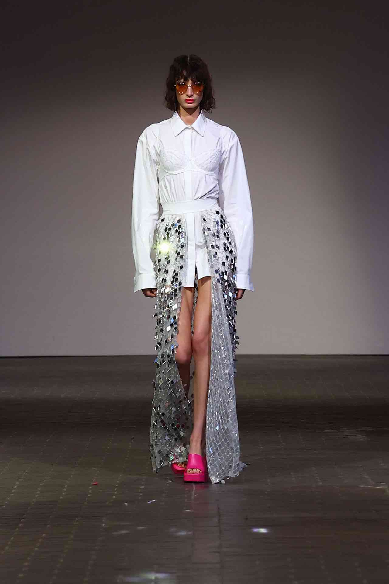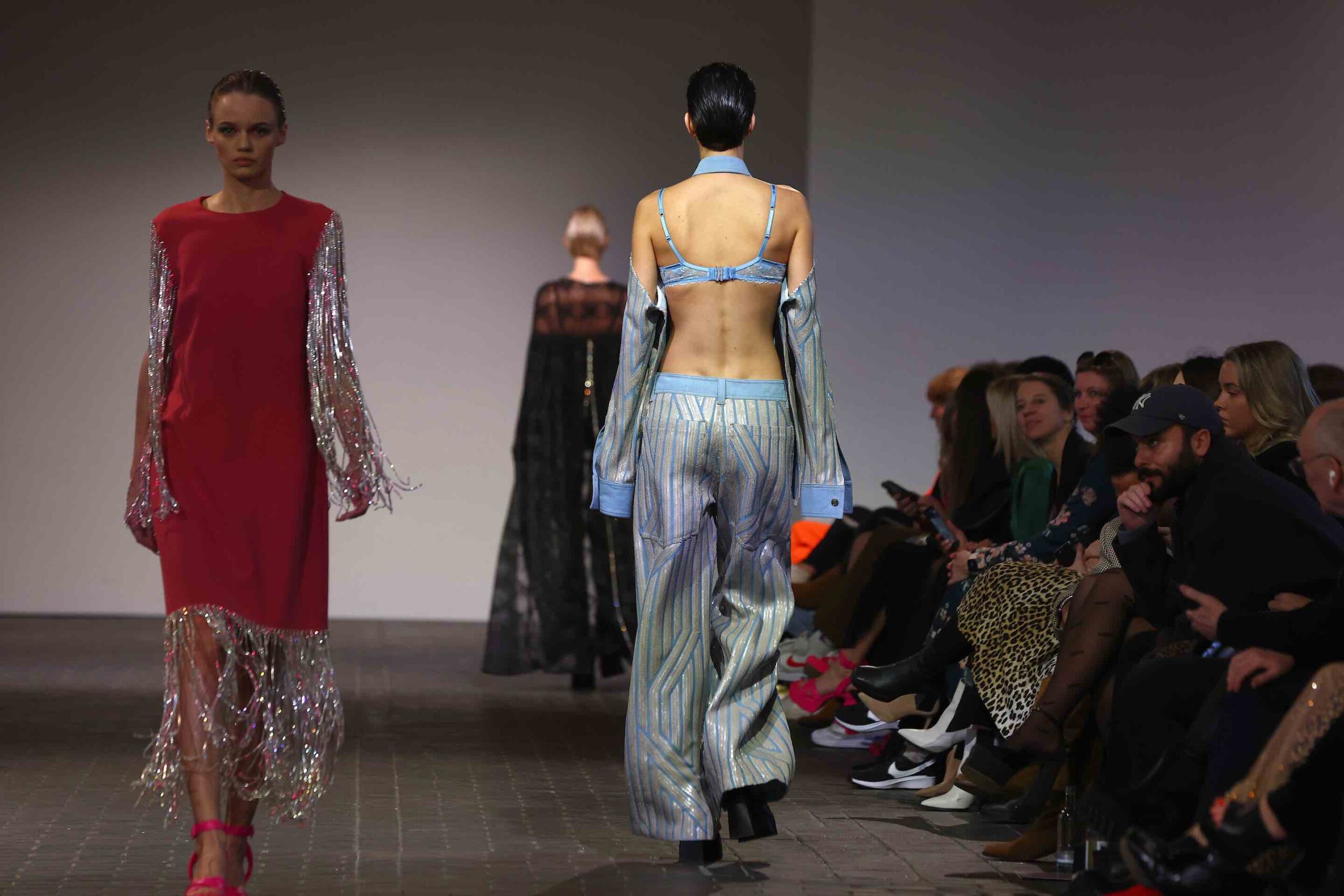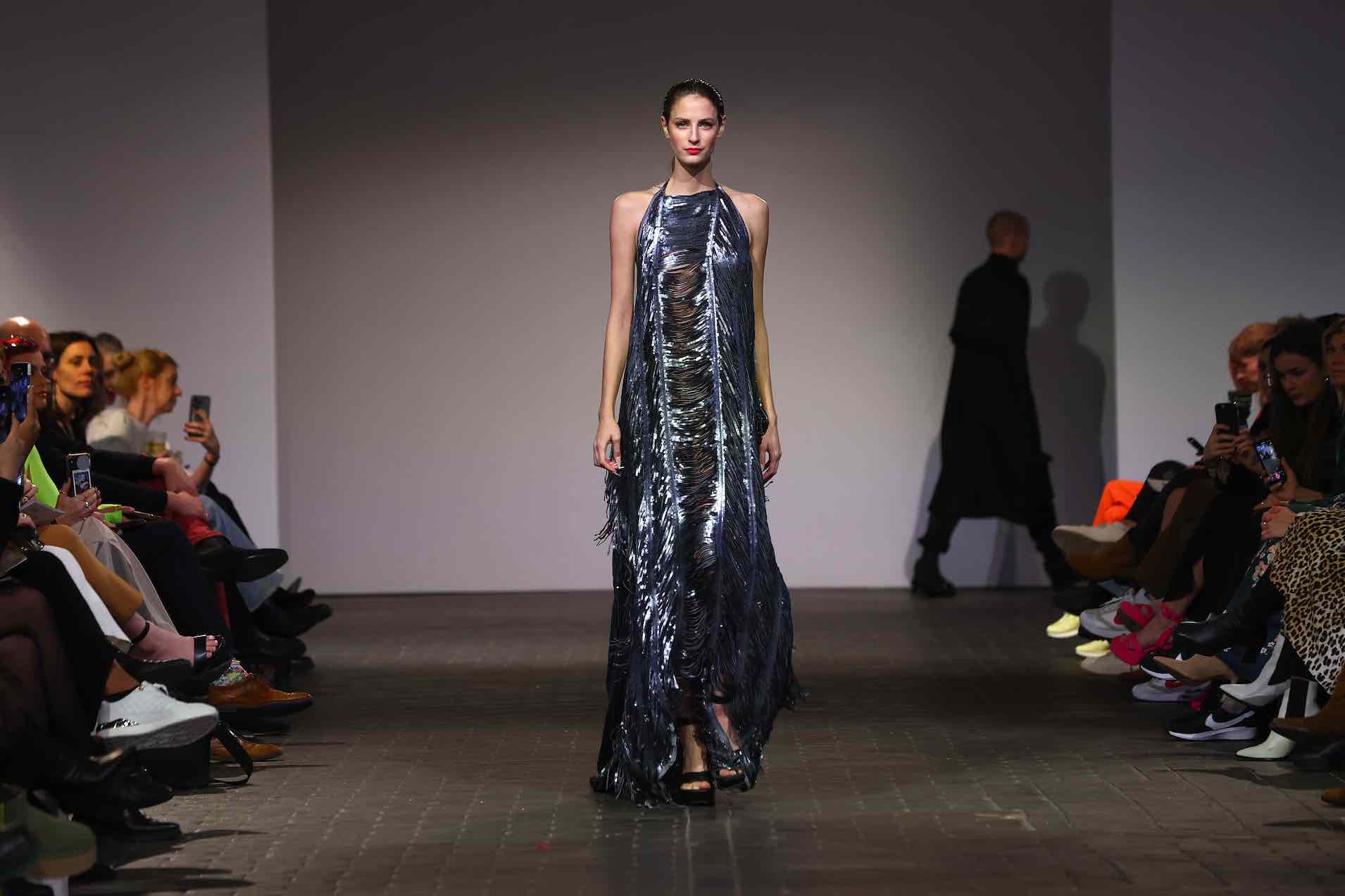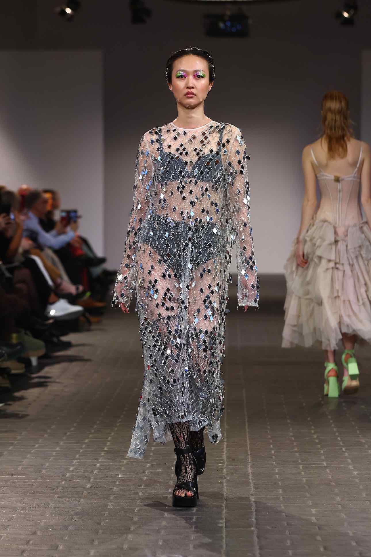 In dieser Saison stechen hochwertige Pailletten im Wetlook und auf Denim, Tüll mit Strass, Hosen und Hemden mit Glitzerkordeln sowie verschlossene Stoff-Schlitze und Looks mit Glasplättchen heraus.