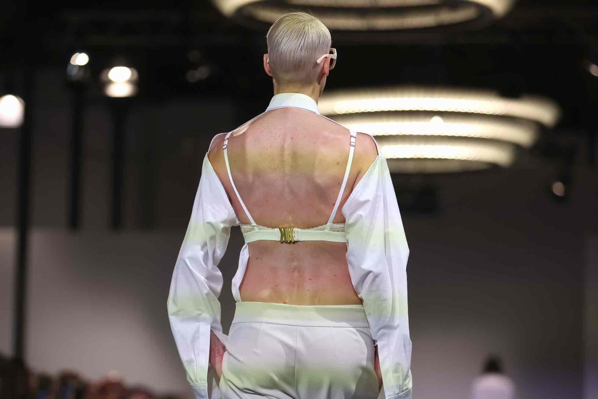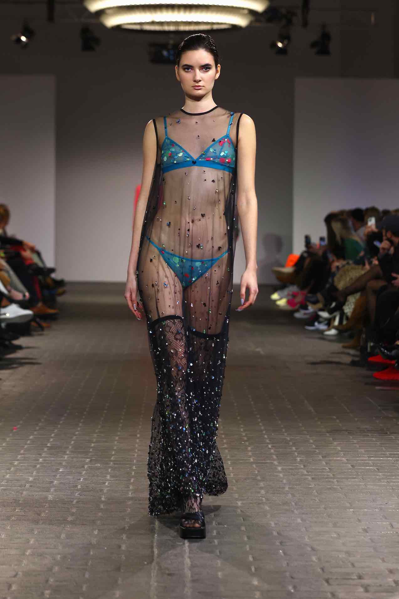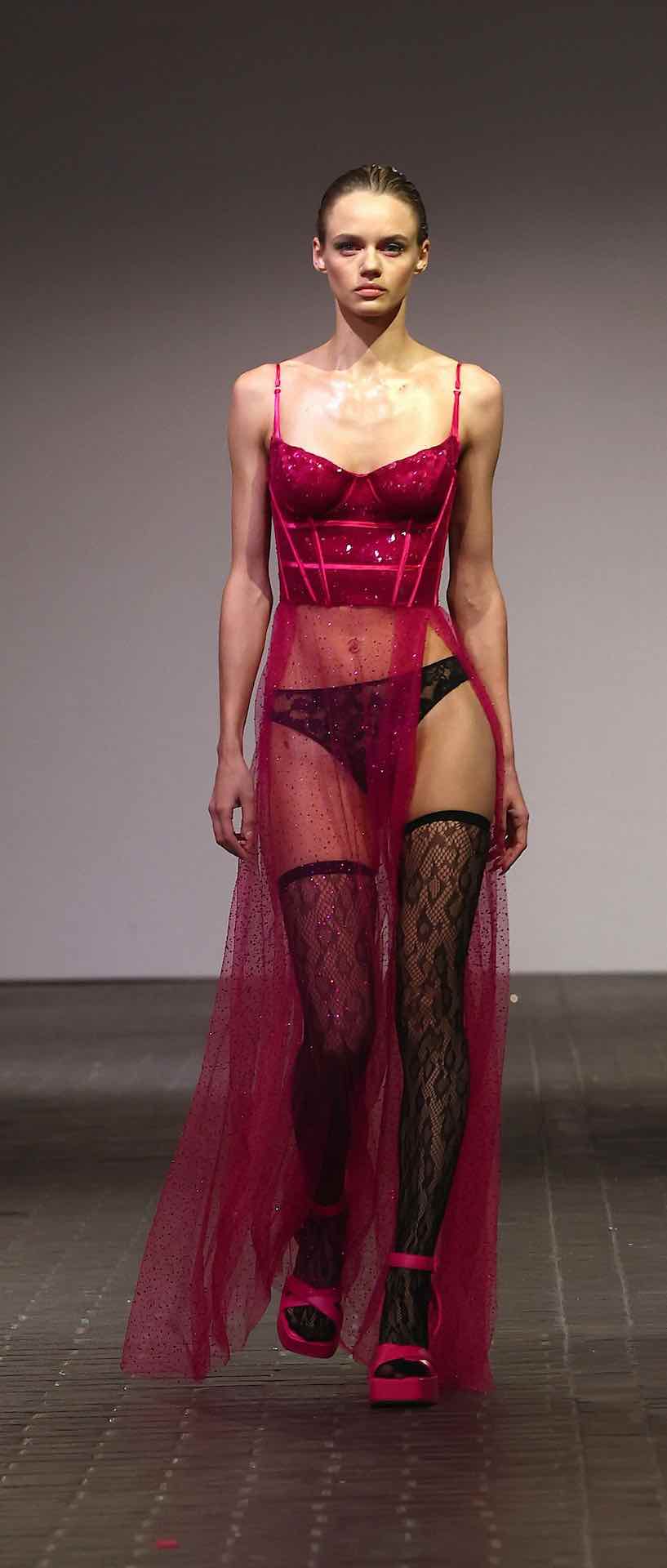 Noch nie war eine Kollektion von Kilian Kerner Berlin so sexy: Transparente Stoffe, freie Rücken und tiefsitzende Pants, die einen Blick auf die verführerische Unterwäsche von mey bieten.