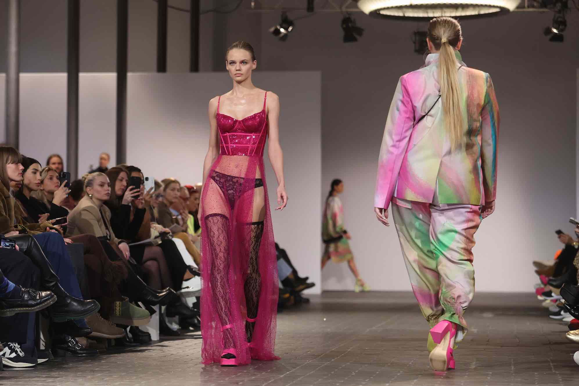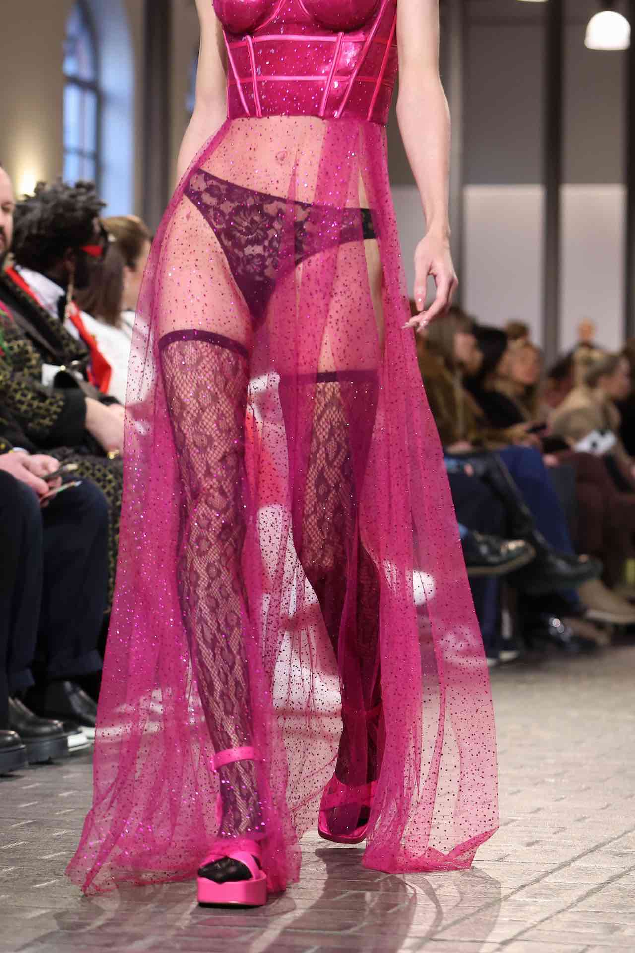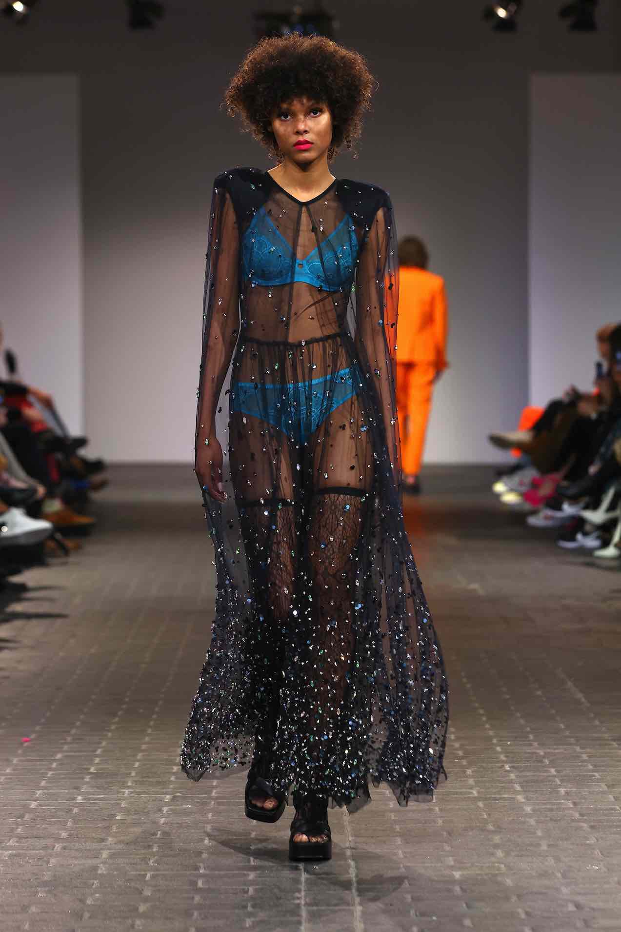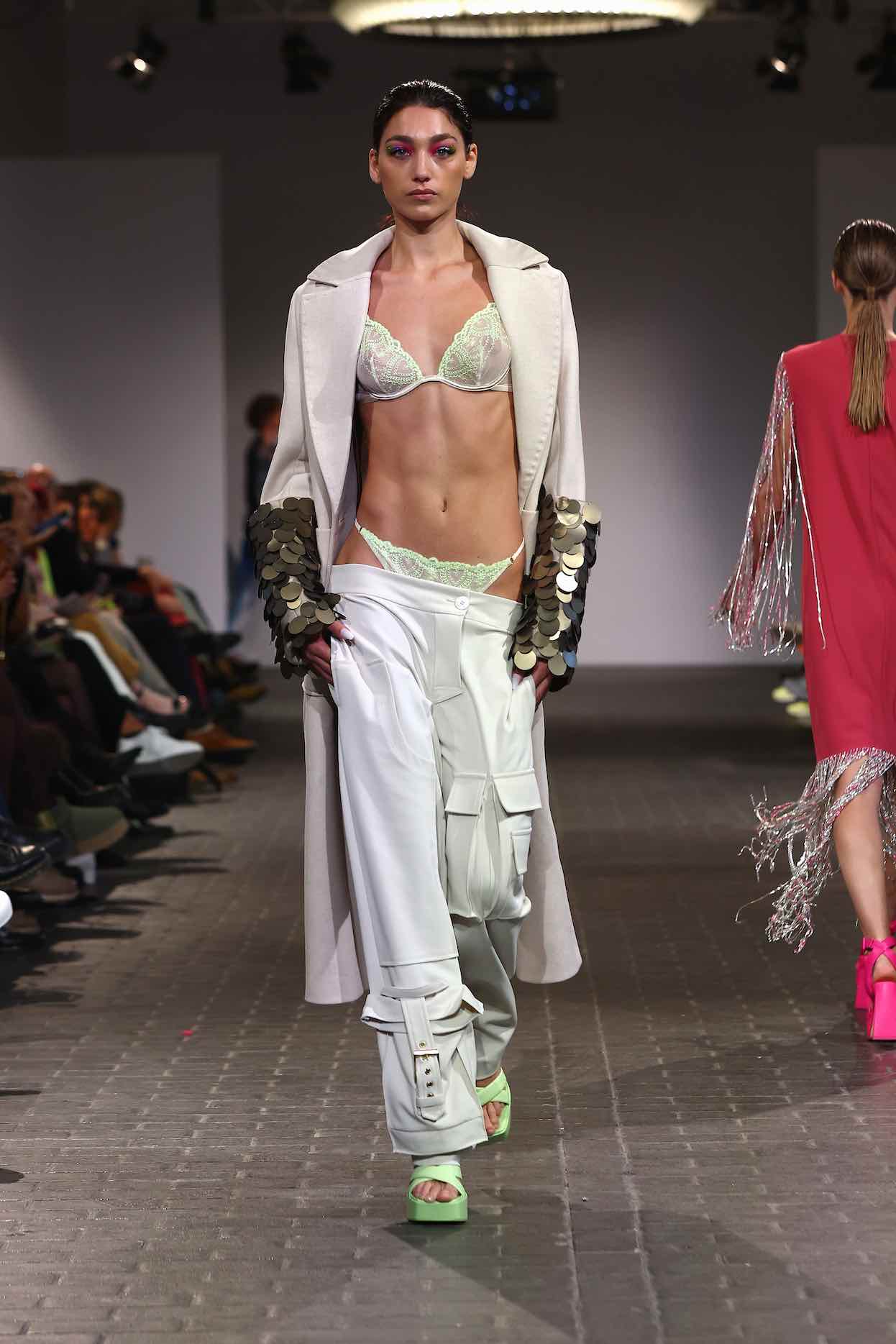 Noch nie war eine Kollektion von Kilian Kerner Berlin so sexy: Transparente Stoffe, freie Rücken und tiefsitzende Pants, die einen Blick auf die verführerische Unterwäsche von mey bieten.