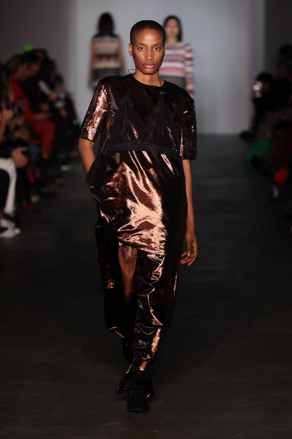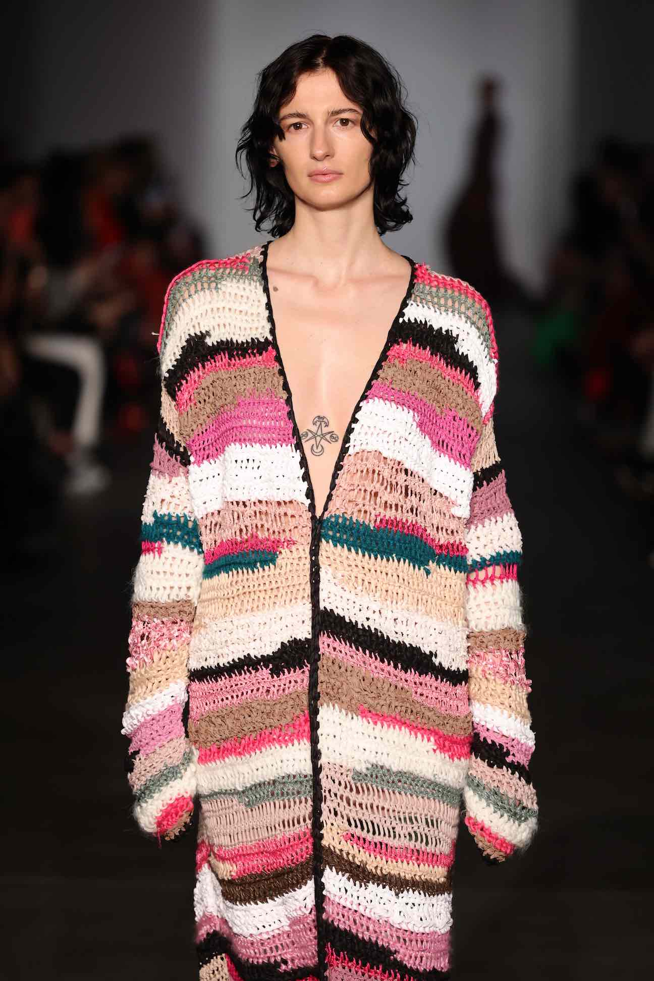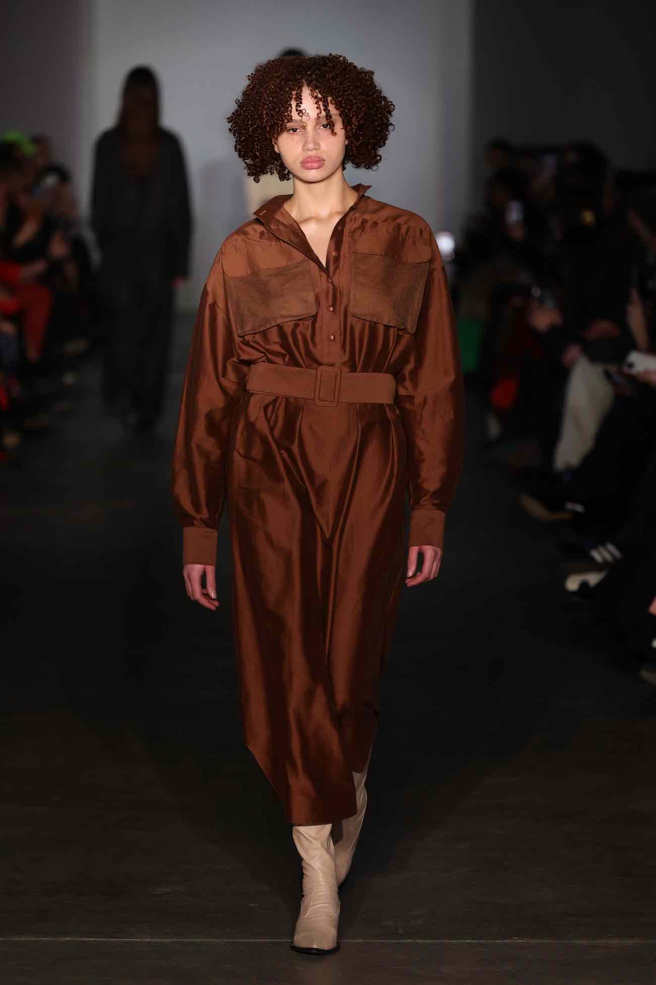 Upcycling-Philosophie regiert in dieser Kollektion, die heldenhaft im Kiewer Atelier der Marke unter den Grenzbedingungen der Kriegszeit – Stromausfall, Heizungsmangel, Fliegeralarm – entstanden ist.