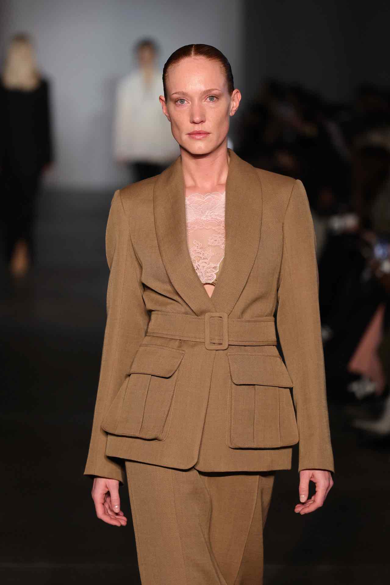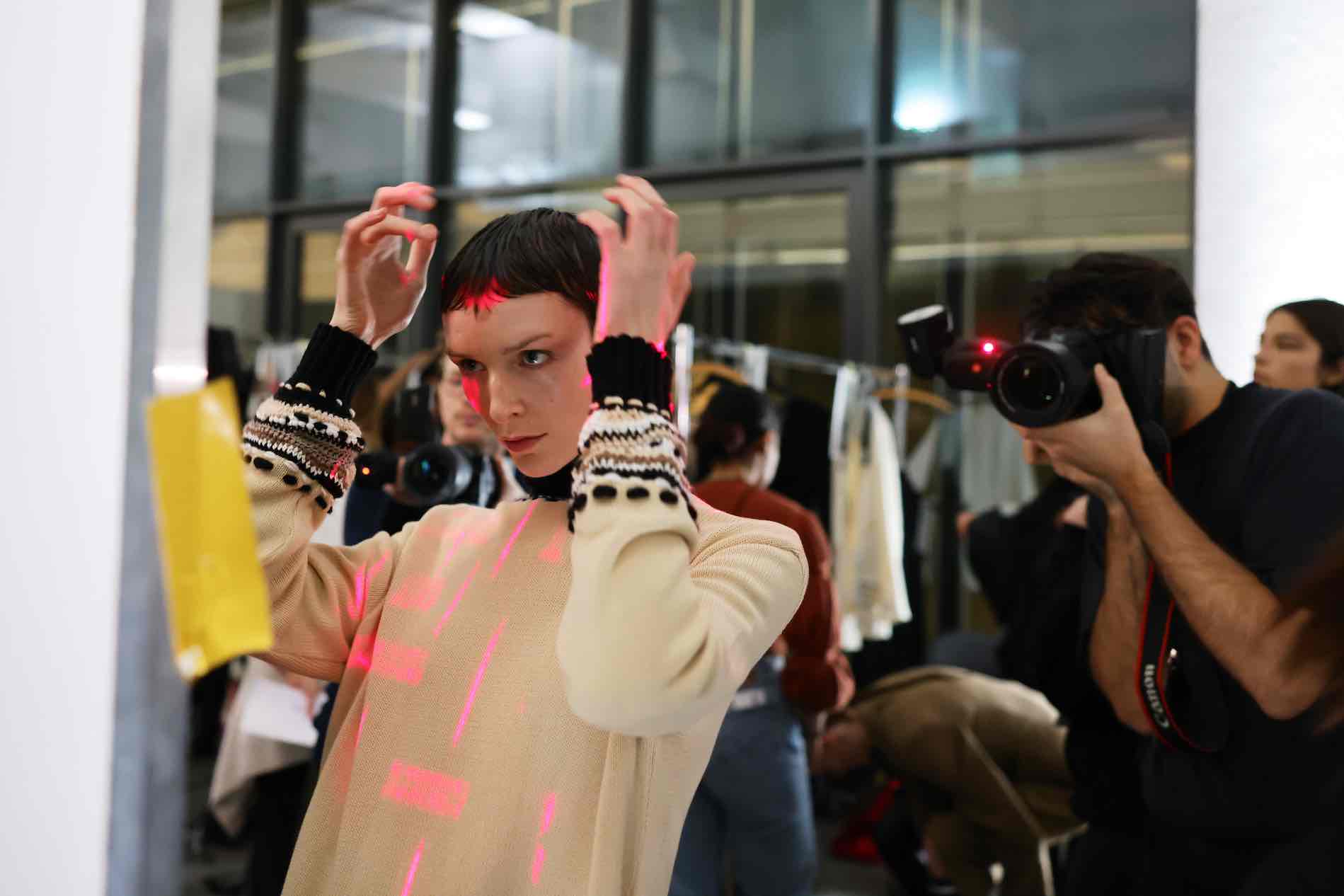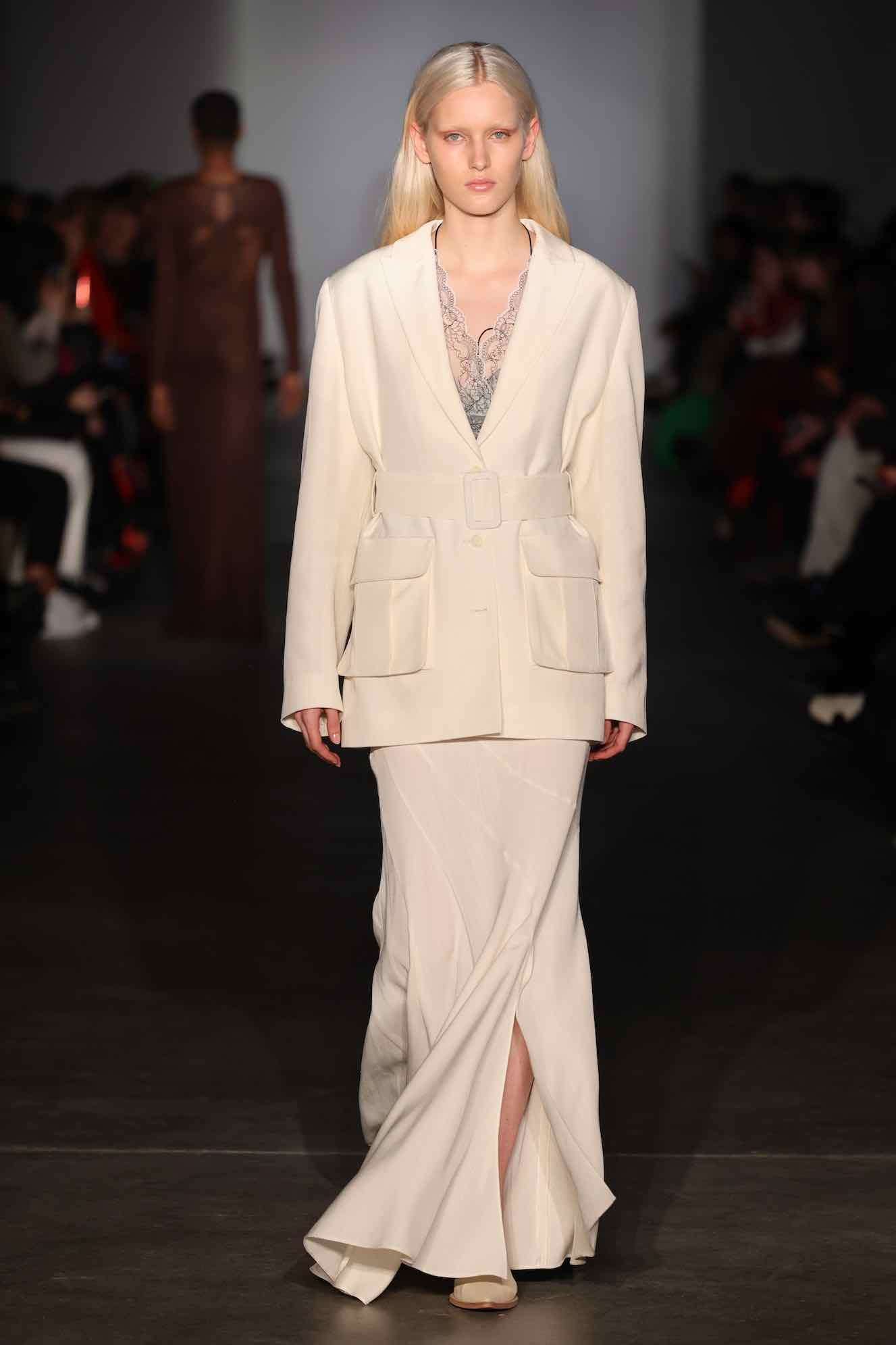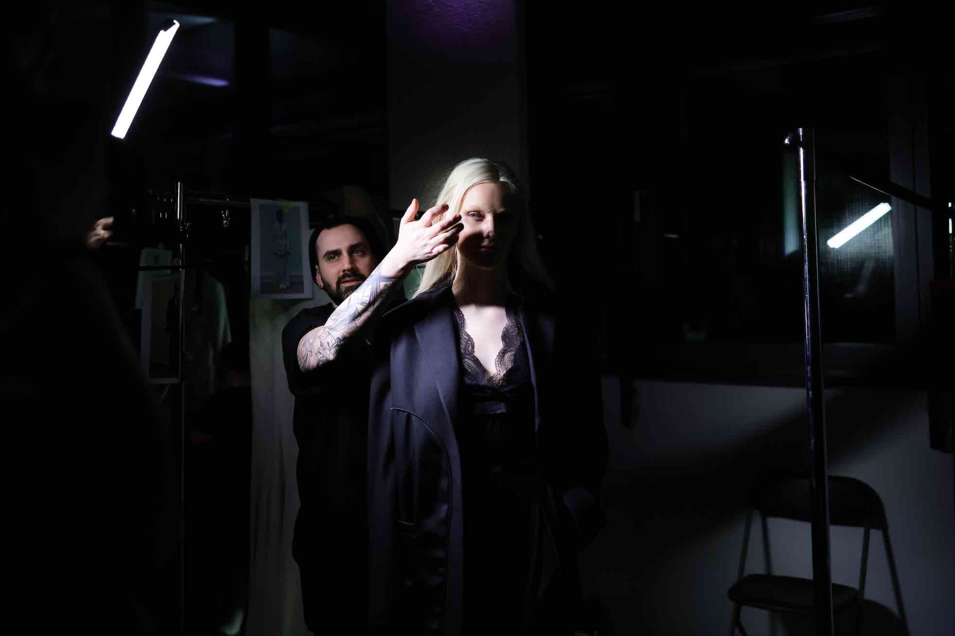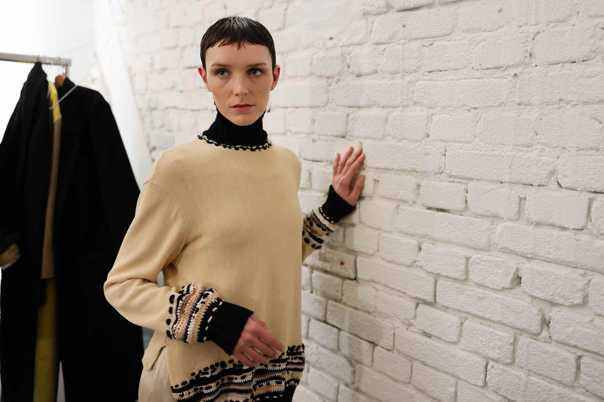 Bobkova übersetzt dieses umstrittene Gleichgewicht von Stärke und Zerbrechlichkeit ihrer Mitfrauen in die Sprache der Kleidung. Die Kollektion ist voll von starken Kontrasten: zarte, feminine Spitze und kuscheliger Strick sprechen von der Suche nach Komfort, grobe Blazer im Army-Look, die den Mut einer Kämpferin repräsentieren.