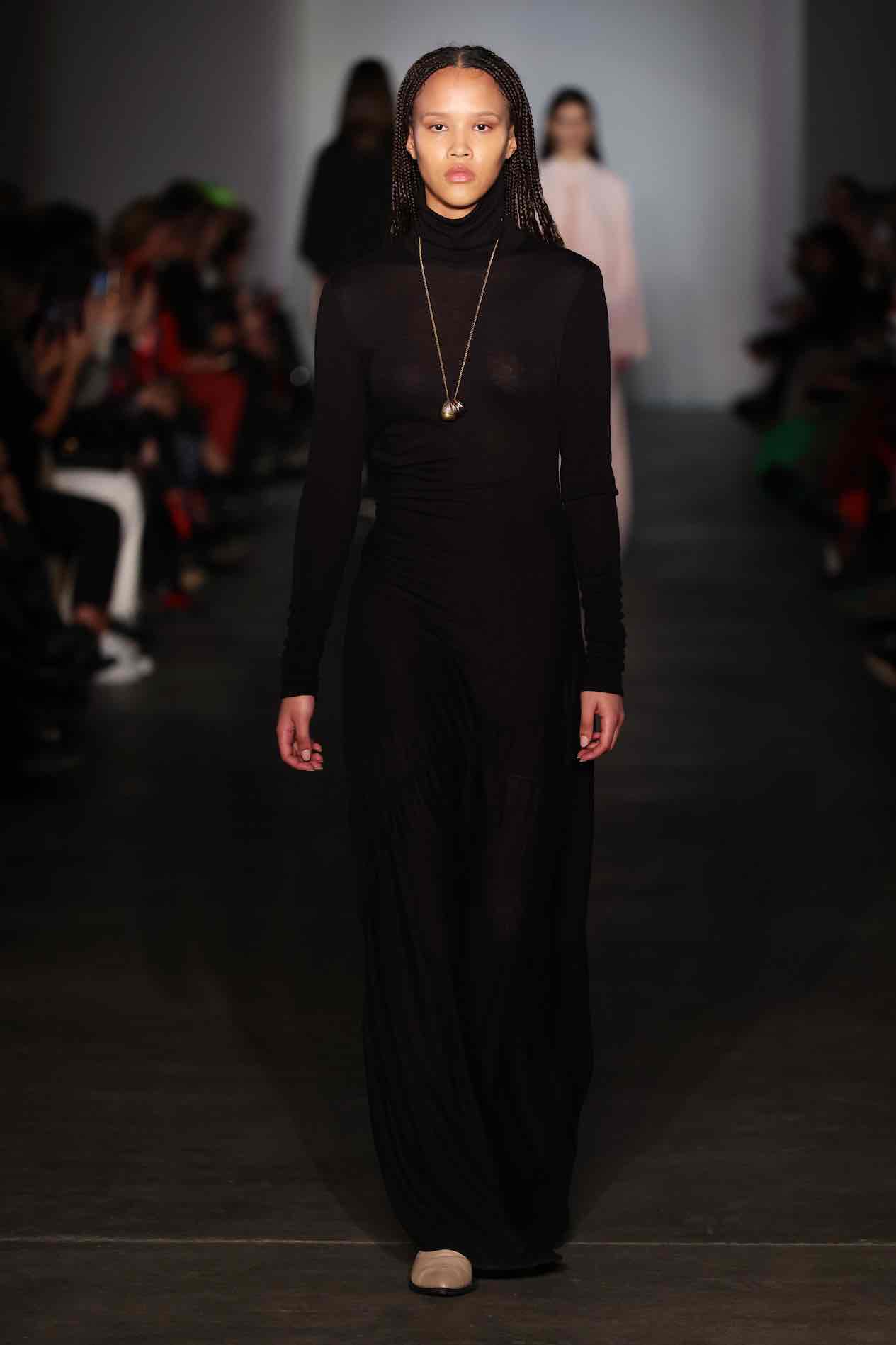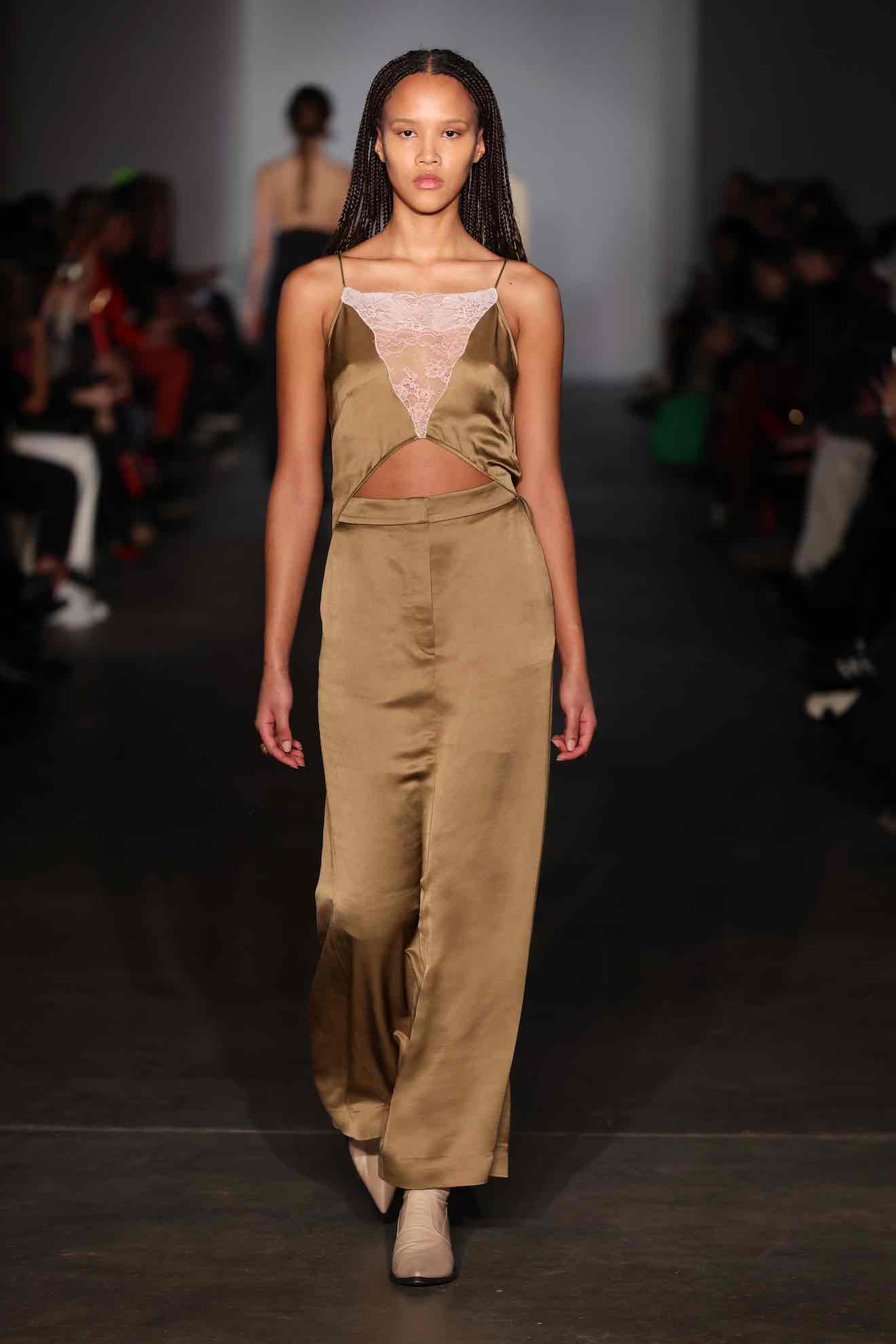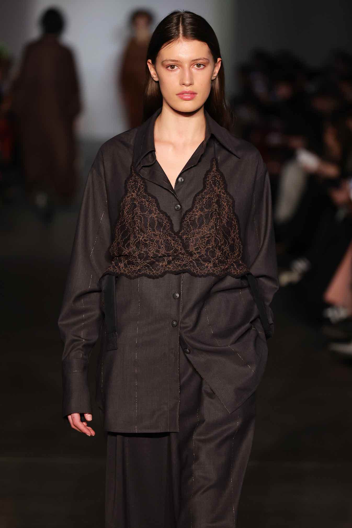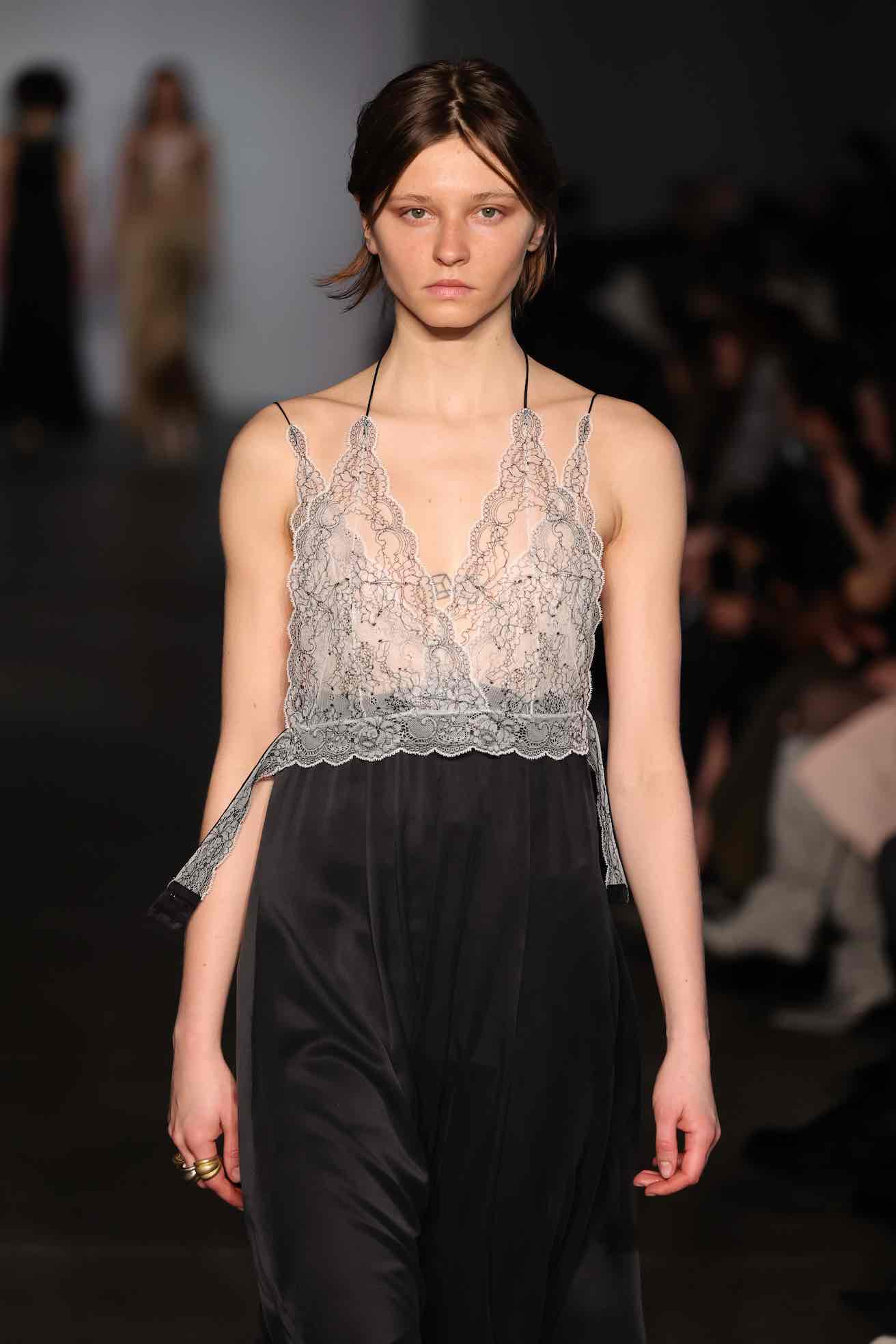 Die Sinnlichkeit der Spitze ist einer der Hauptakzente. Von tief ausgeschnittenen Maxi-Slips und BHs im Stil der 90er-Jahre bis hin zu Upcycling-Patchwork-Minikleidern und -röcken in A-Linie, die in den 60er Jahren mit Lederstrumpfstiefeln à la Françoise Hardy gestylt wurden, die Spitze verleiht BOBKOVAs unverkennbaren strengen minimalistischen Schnitten zarte Weichheit.