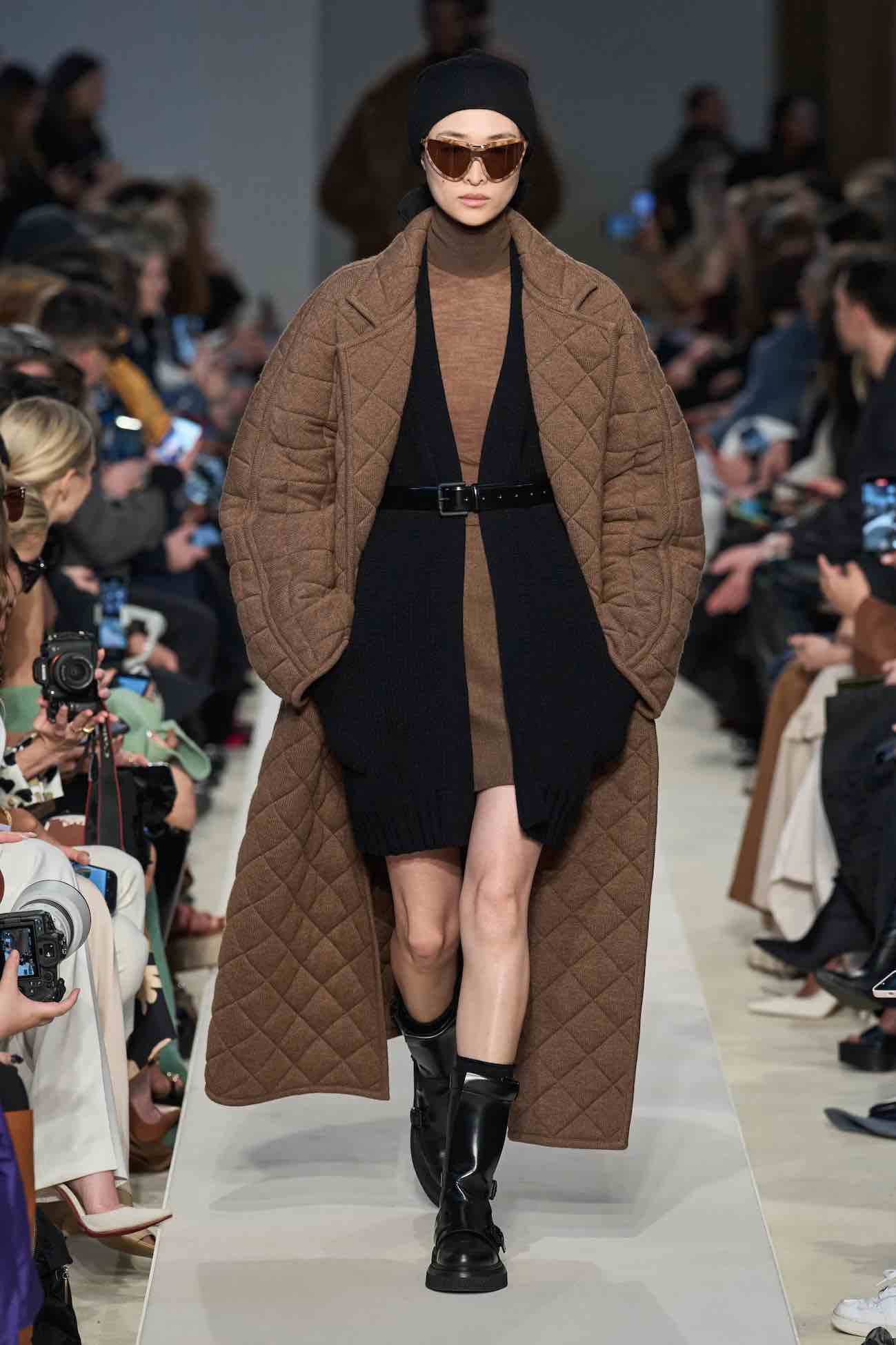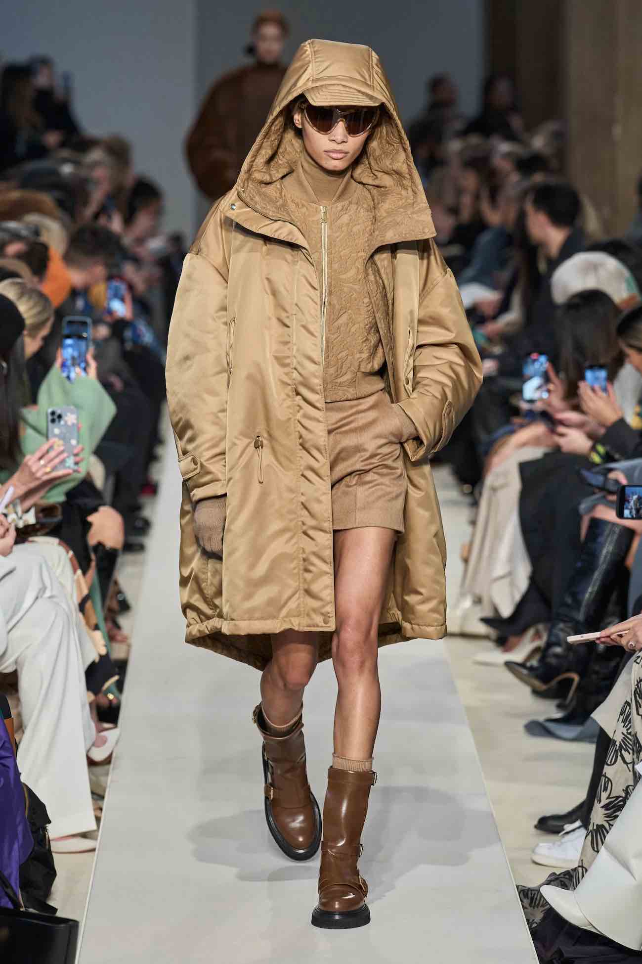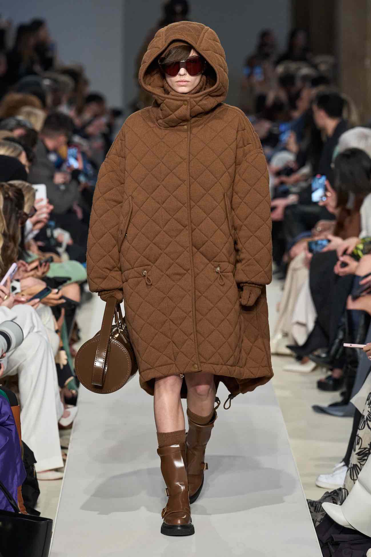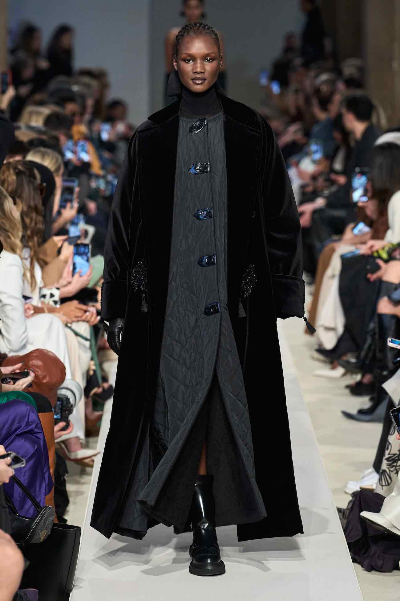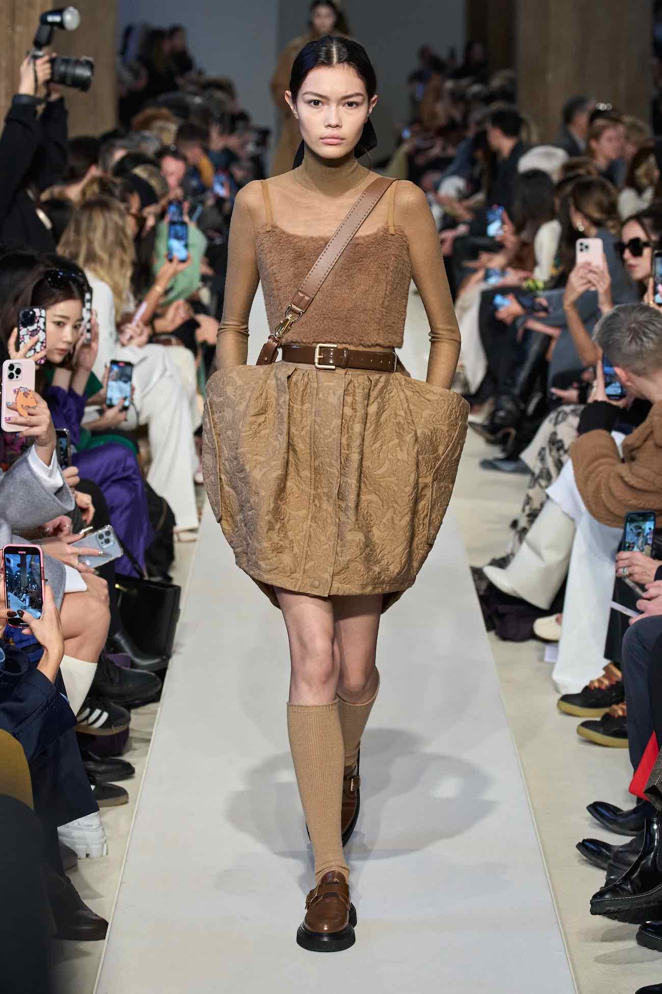 Max Mara zeigt die typischen Teddyfell-Mäntel allerdings in neuen pudrigen Pastelltönen. Dazu Strickkleider Ton-in-Ton und passende Mützen und Handschuhe. Edles Brokat und Samt in sportiver junger Optik. Festliches Styling in Chiffre mit derben Schuhwerk auf stylisch getrimmt. Wie immer eine sehr gelungene Kollektion.