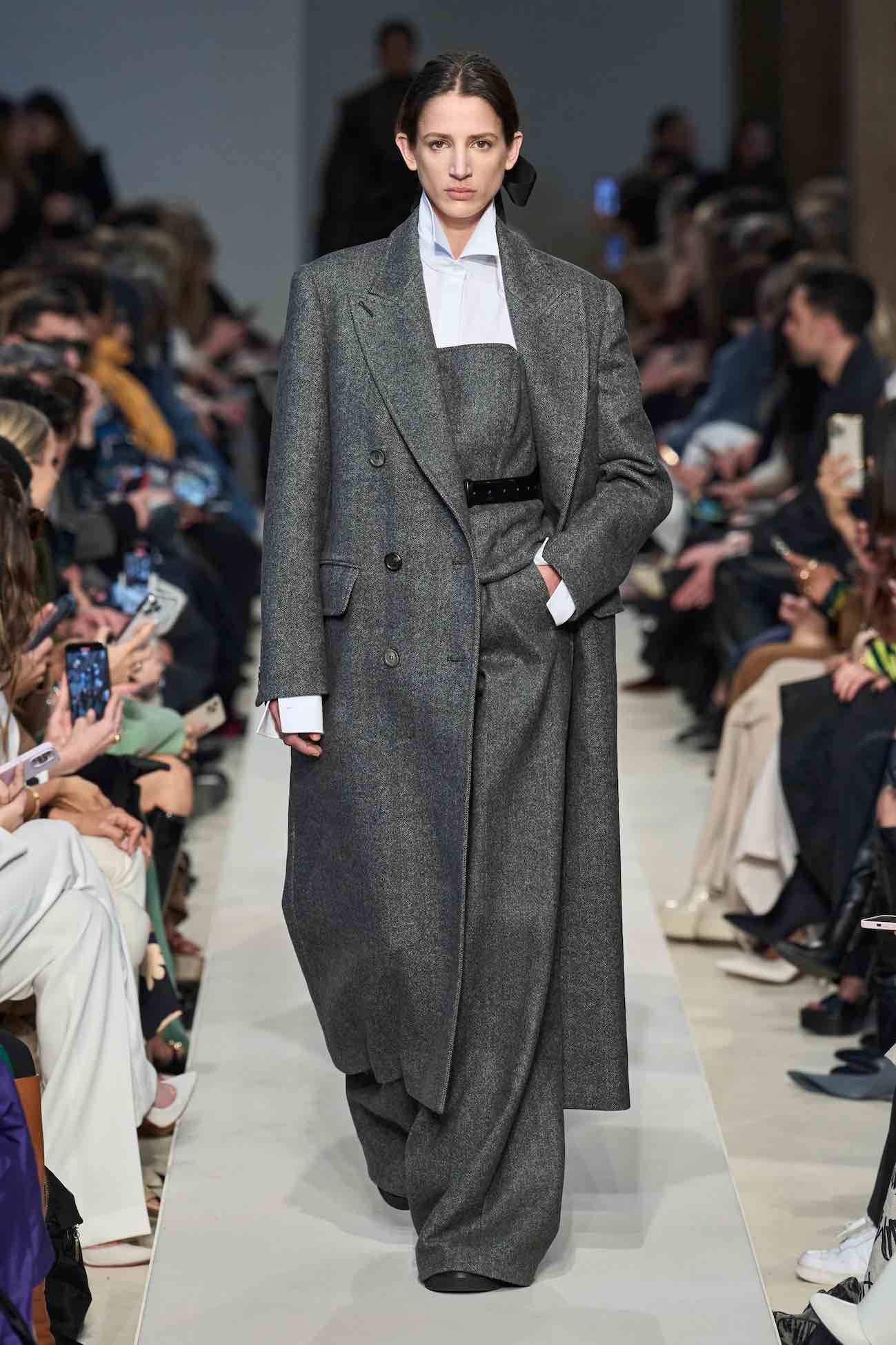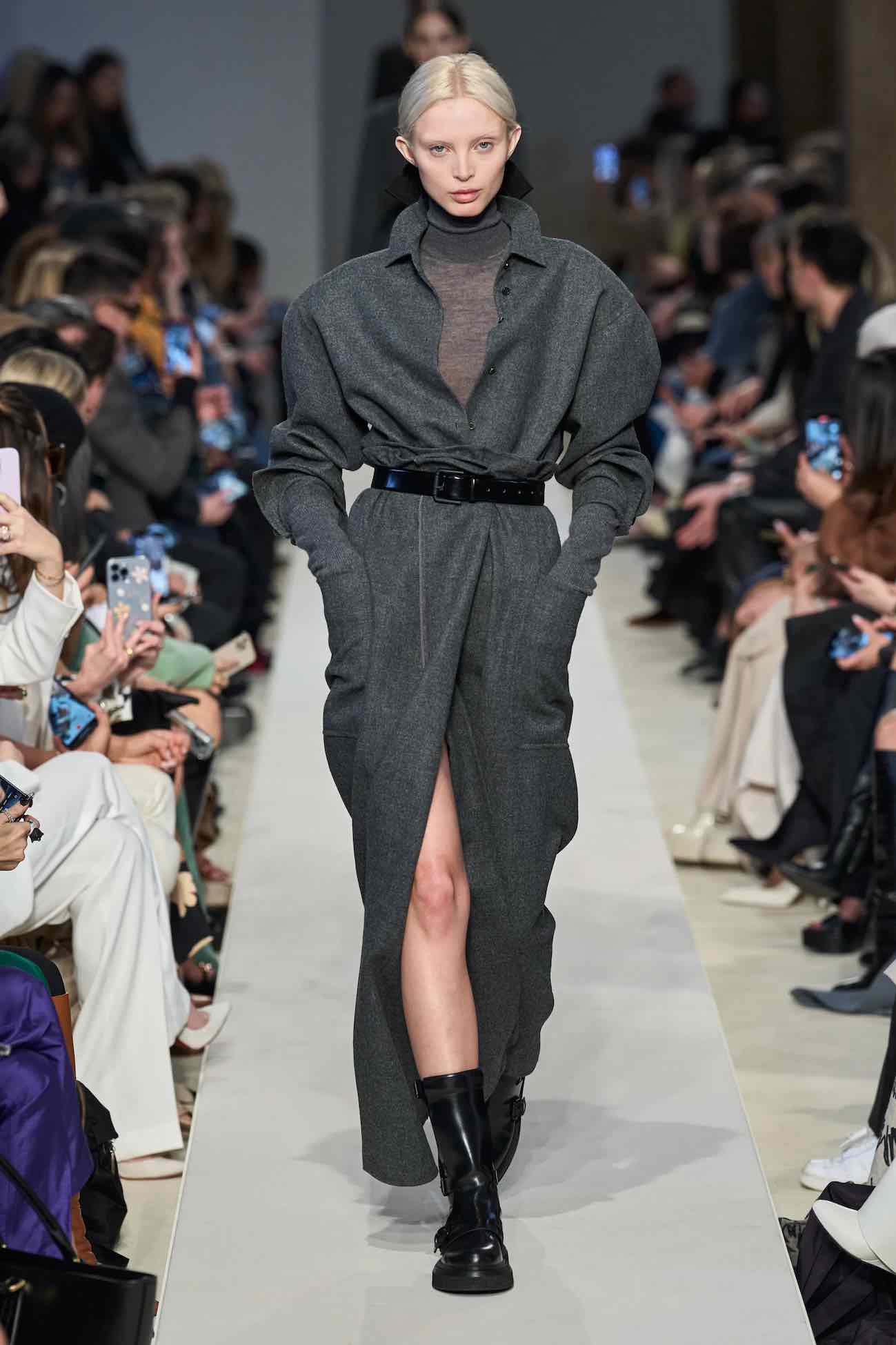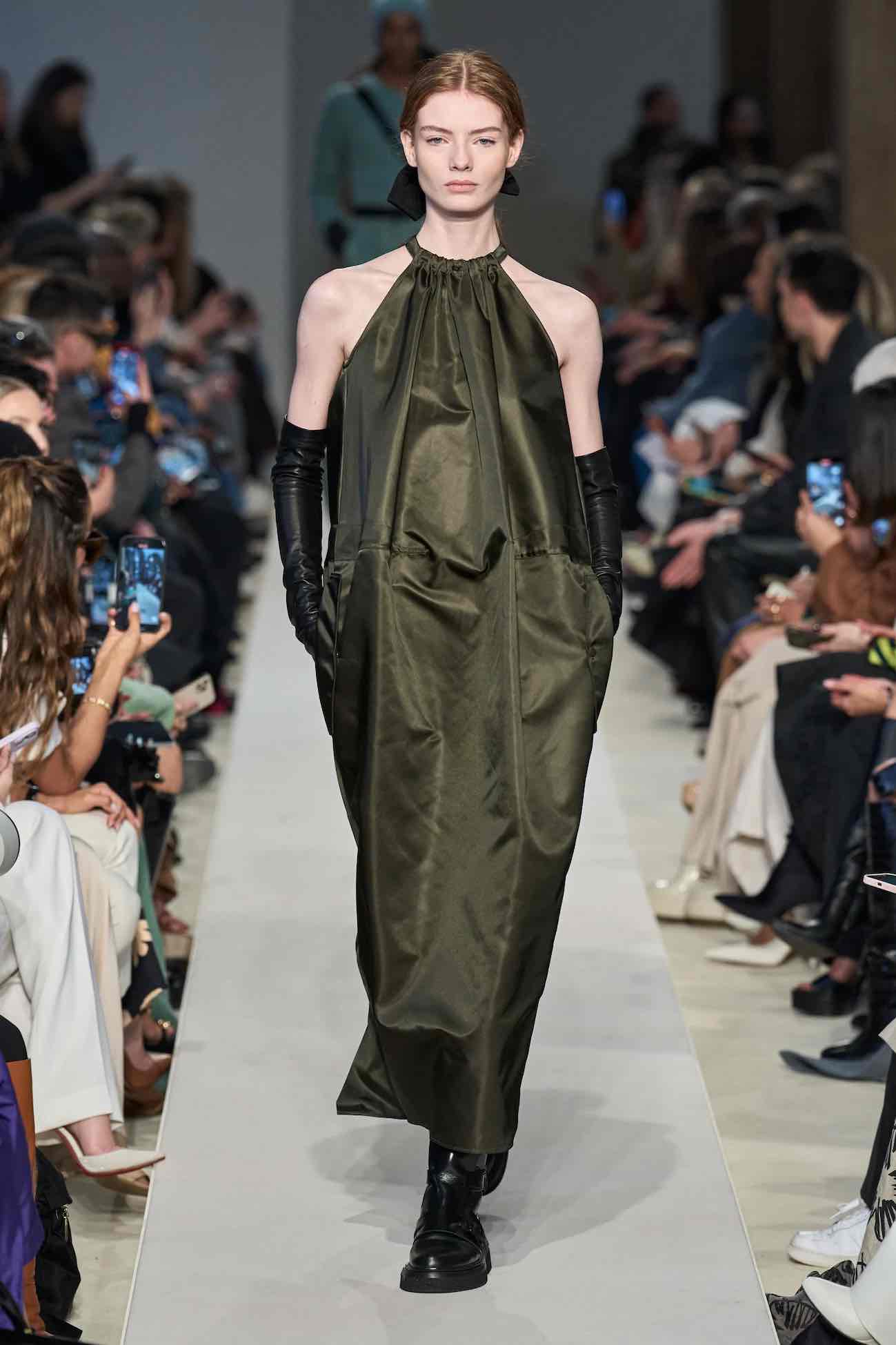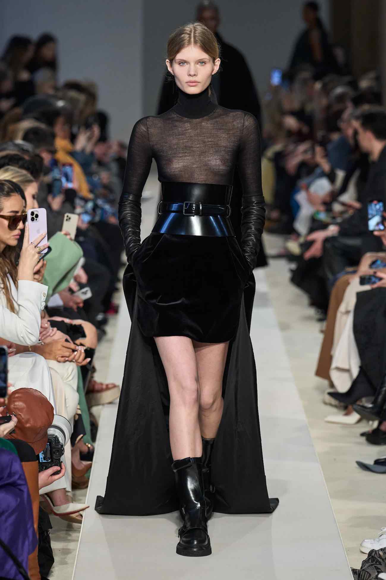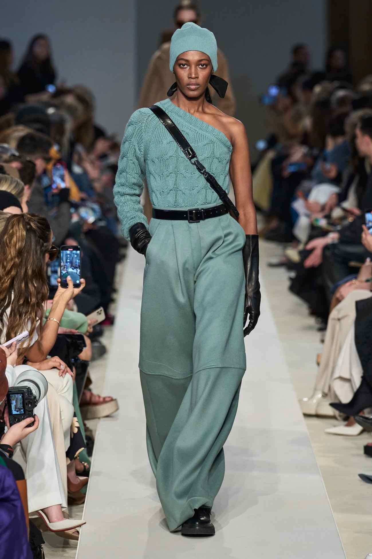 Max Mara zeigt die typischen Teddyfell-Mäntel allerdings in neuen pudrigen Pastelltönen. Dazu Strickkleider Ton-in-Ton und passende Mützen und Handschuhe. Edles Brokat und Samt in sportiver junger Optik. Festliches Styling in Chiffre mit derben Schuhwerk auf stylisch getrimmt. Wie immer eine sehr gelungene Kollektion.